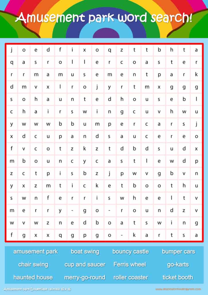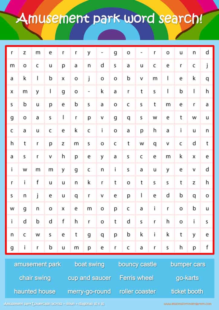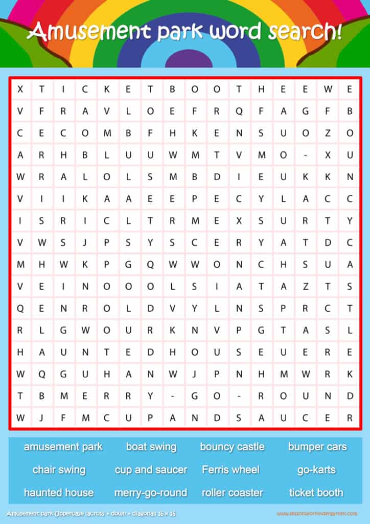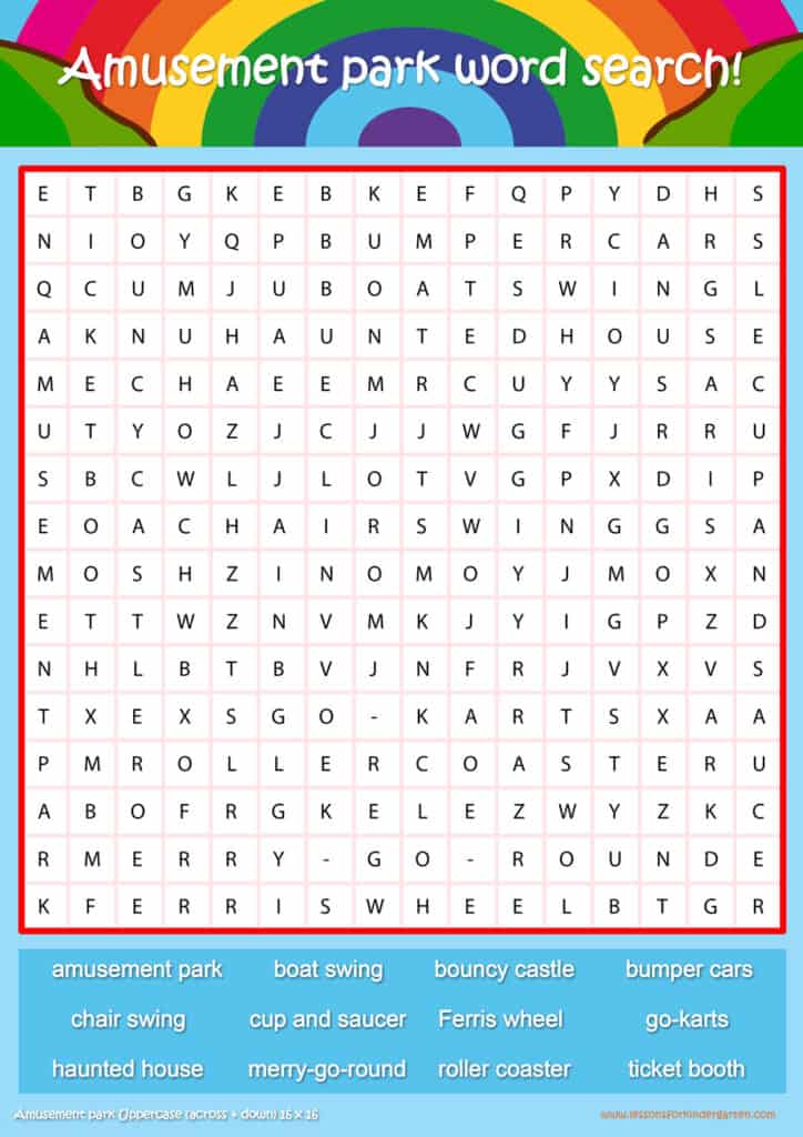 Free Amusement park word search puzzle sheets for kids! Simply click and download the PDFS for FREE! These Amusement park word search puzzle sheets are perfect for reinforcing vocabulary your children have learned in your lesson! The worksheets are designed to be used as an activity after teaching your topic’s vocabulary. The Amusement park word search puzzles help with letter recognition, reading and spelling.