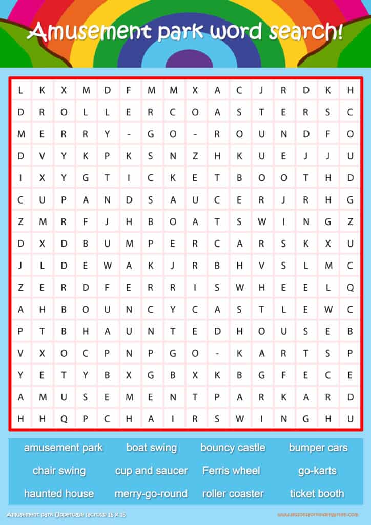 | Amusement park Uppercase Word Search Puzzle 16 x 16 | Read 12 Amusement park vocabulary words in uppercase. |
