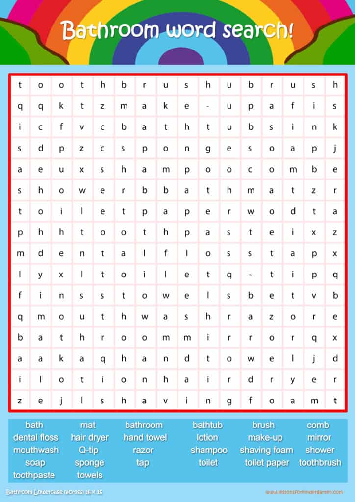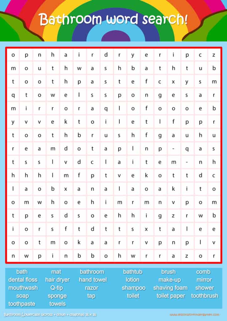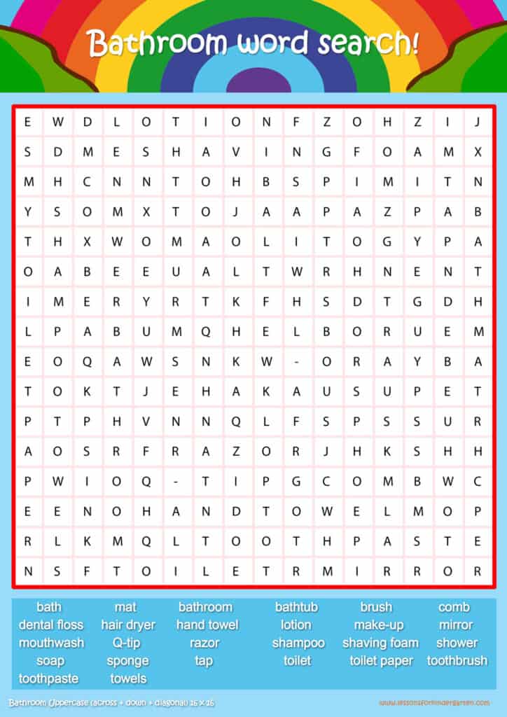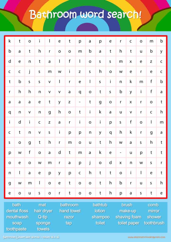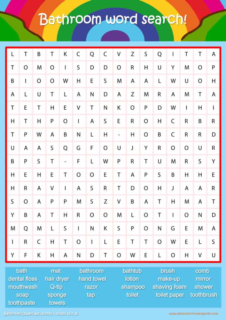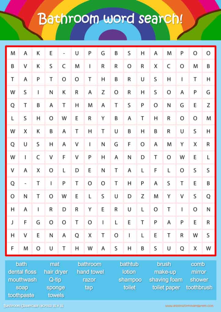 Free bathroom word search puzzle sheets for kids! Simply click and download the PDFS for FREE! These bathroom word search puzzle sheets are perfect for reinforcing vocabulary your children have learned in your lesson! The worksheets are designed to be used as an activity after teaching your topic’s vocabulary. The bathroom word search puzzles help with letter recognition, reading and spelling.