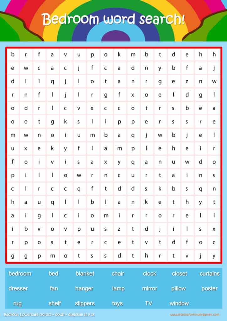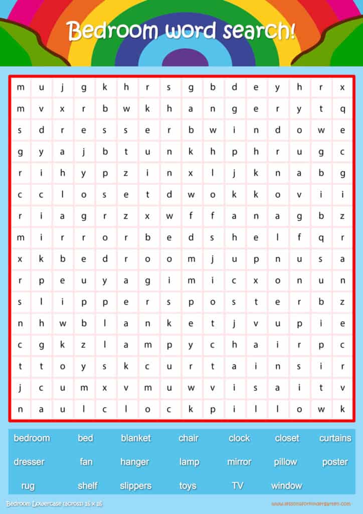 | Bedroom Lowercase Word Search Puzzle 16 x 16 | Read 20 Bedroom vocabulary words in lowercase. |