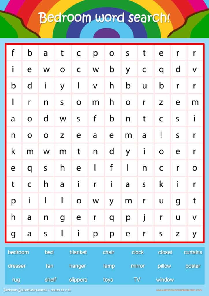 | Bedroom Lowercase Word Search Puzzle 12 x 12 | Read 20 Bedroom vocabulary words in lowercase. |