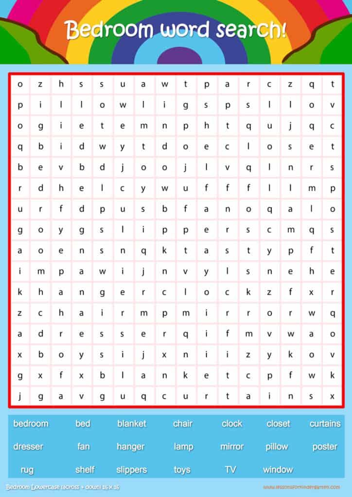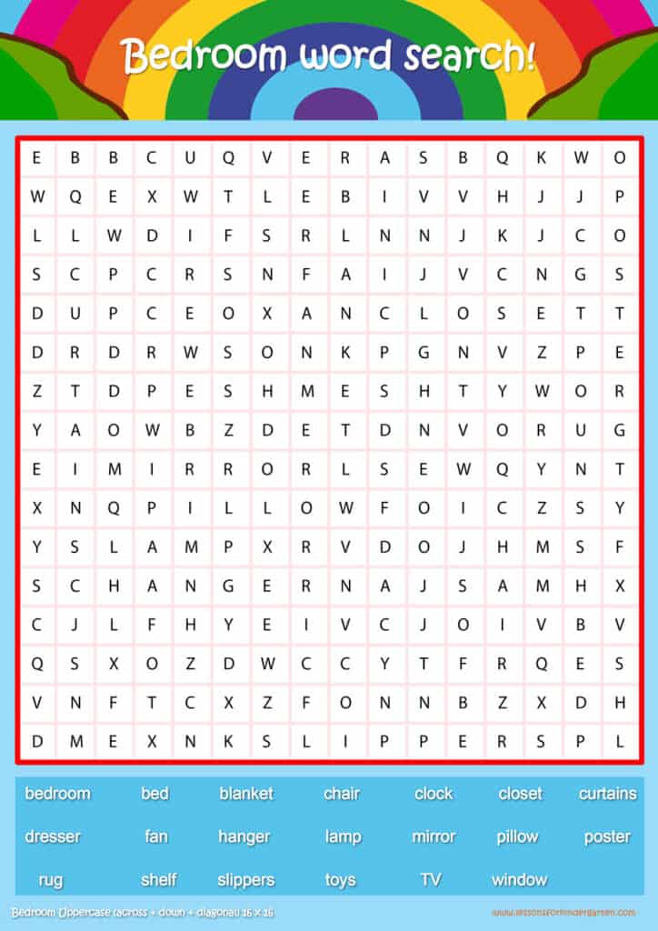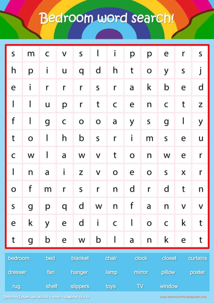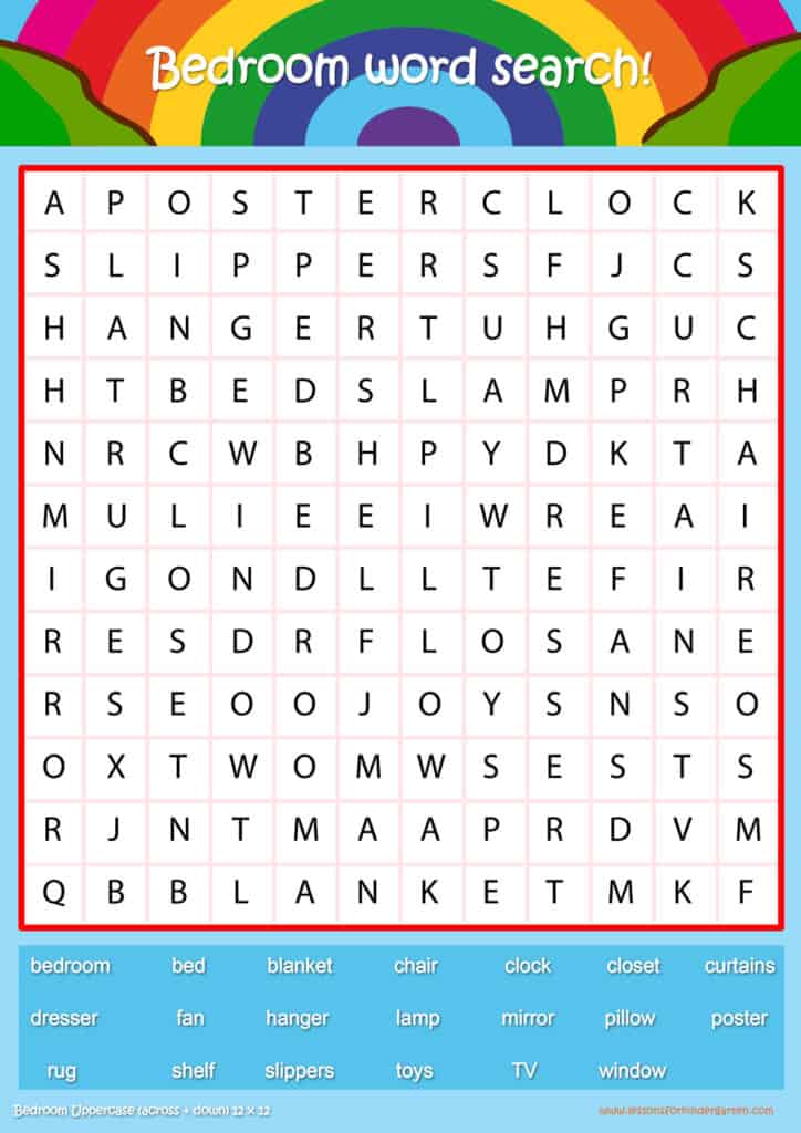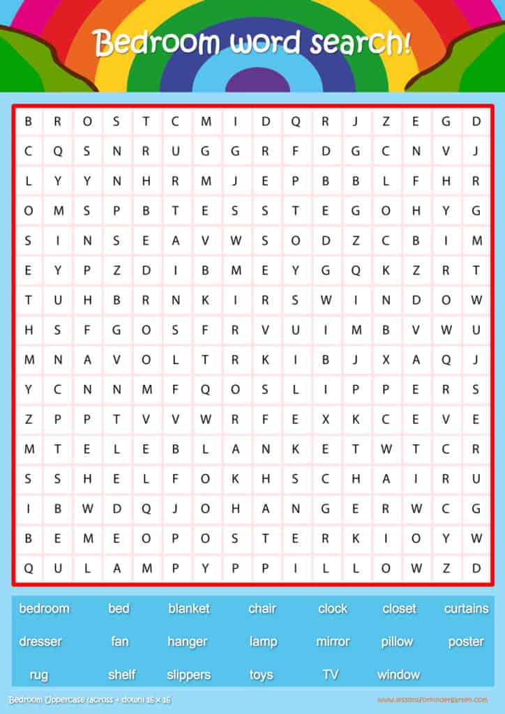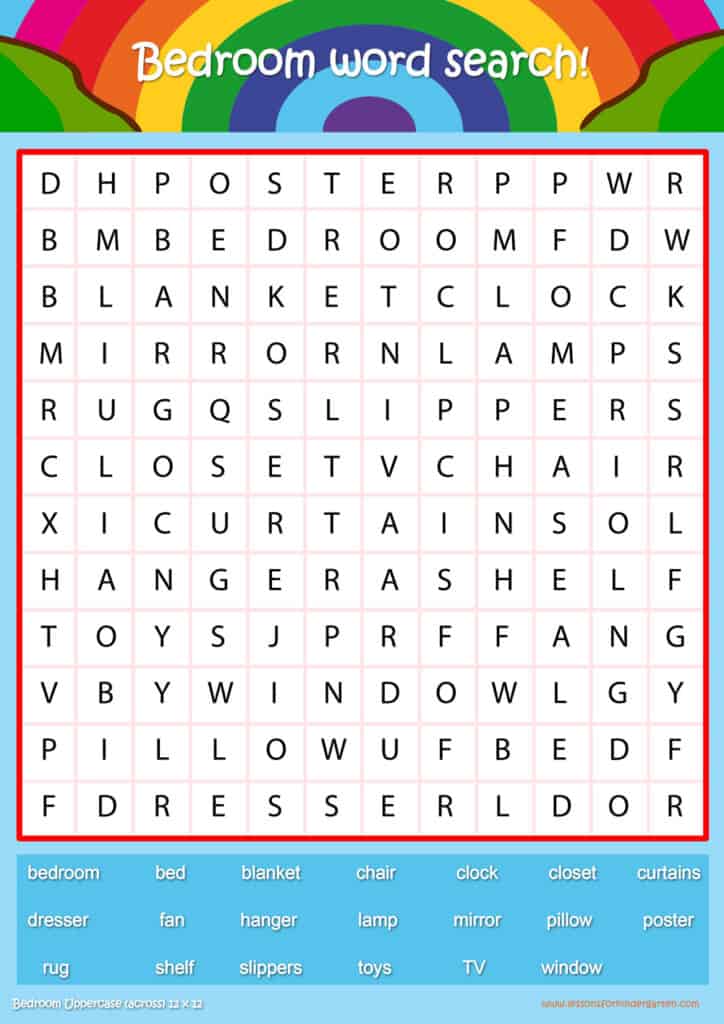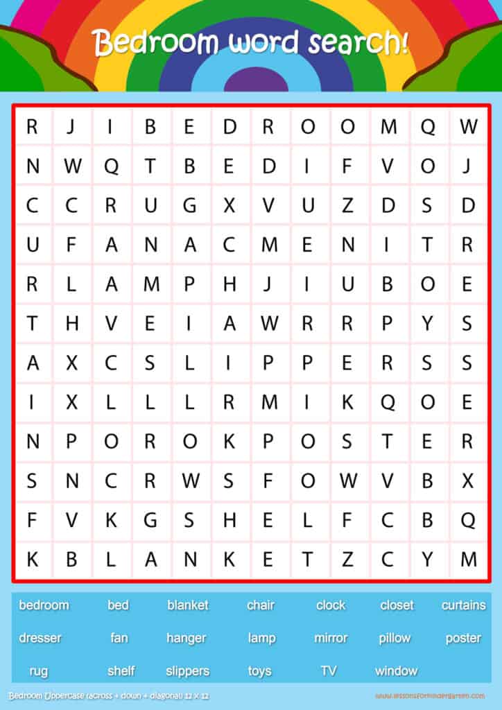 Free bedroom word search puzzle sheets for kids! Simply click and download the PDFS for FREE! These bedroom word search puzzle sheets are perfect for reinforcing vocabulary your children have learned in your lesson! The worksheets are designed to be used as an activity after teaching your topic’s vocabulary. The bedroom word search puzzles help with letter recognition, reading and spelling.