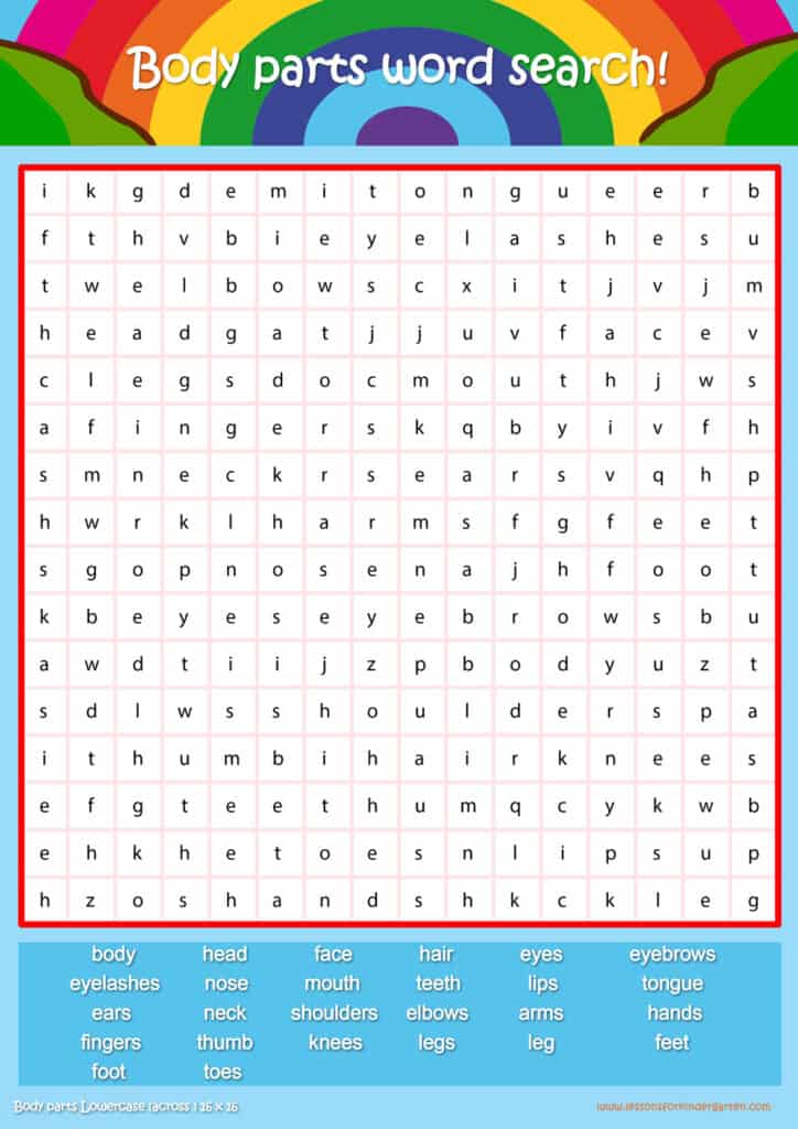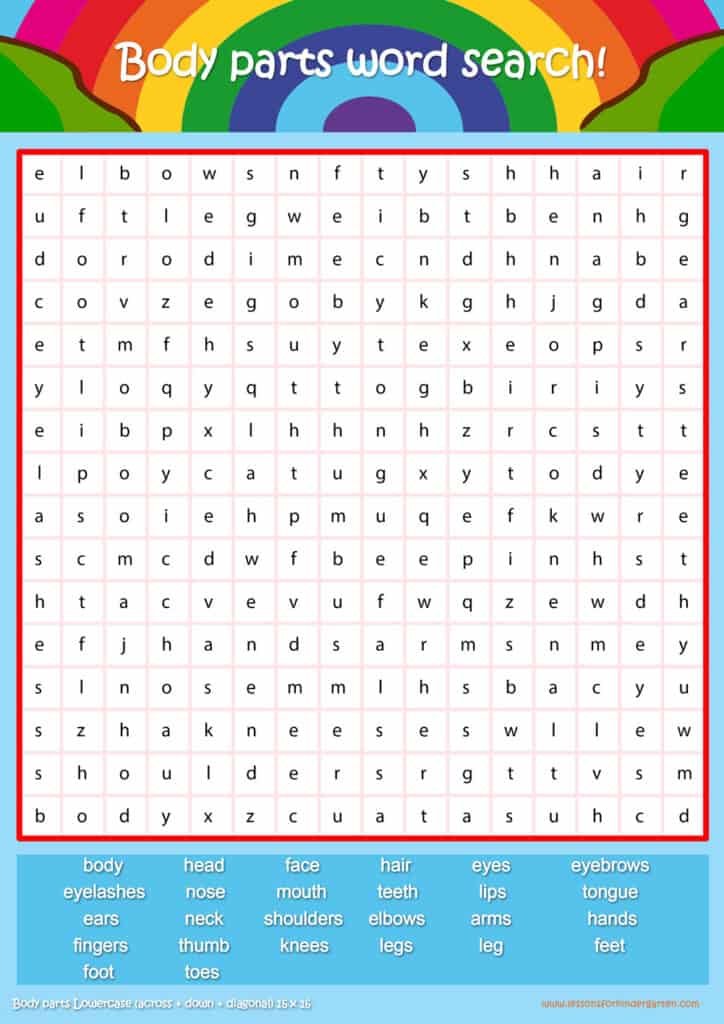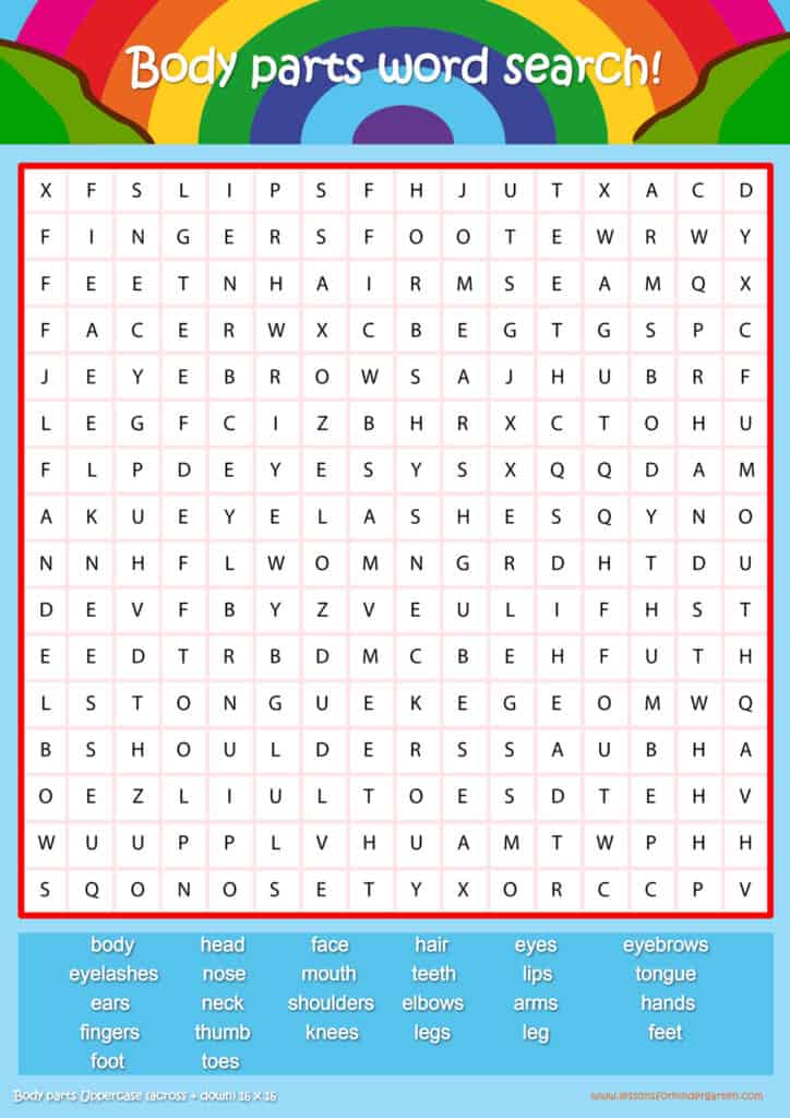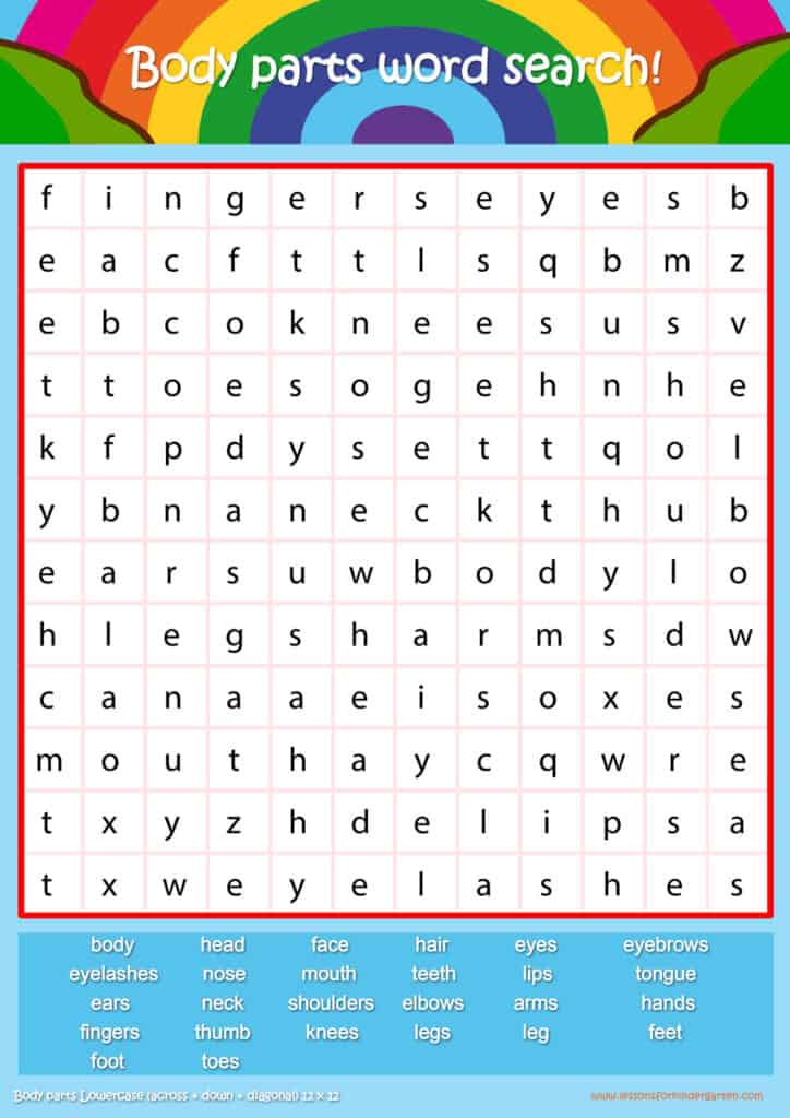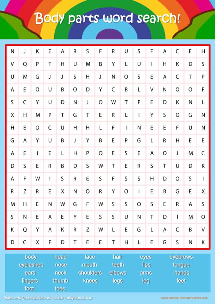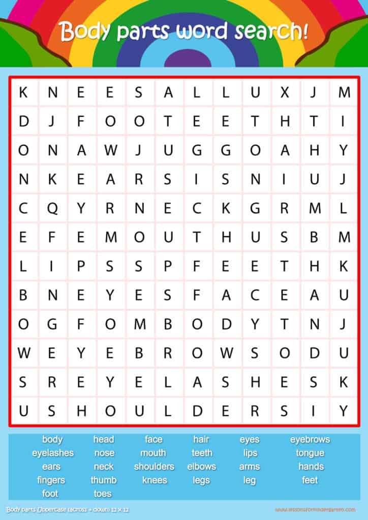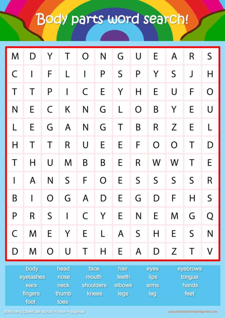 Free body parts word search puzzle sheets for kids! Simply click and download the PDFS for FREE! These body parts word search puzzle sheets are perfect for reinforcing vocabulary your children have learned in your lesson! The worksheets are designed to be used as an activity after teaching your topic’s vocabulary. The body parts word search puzzles help with letter recognition, reading and spelling.