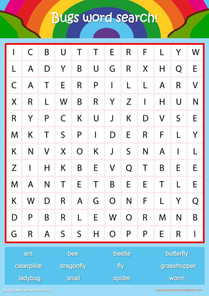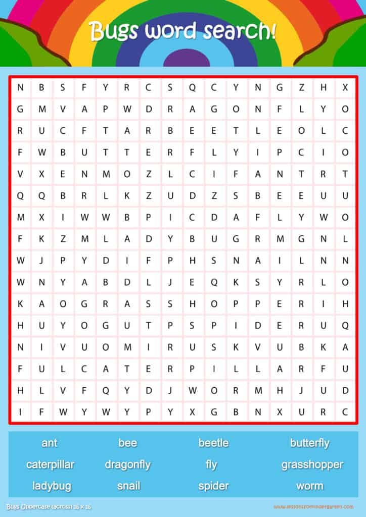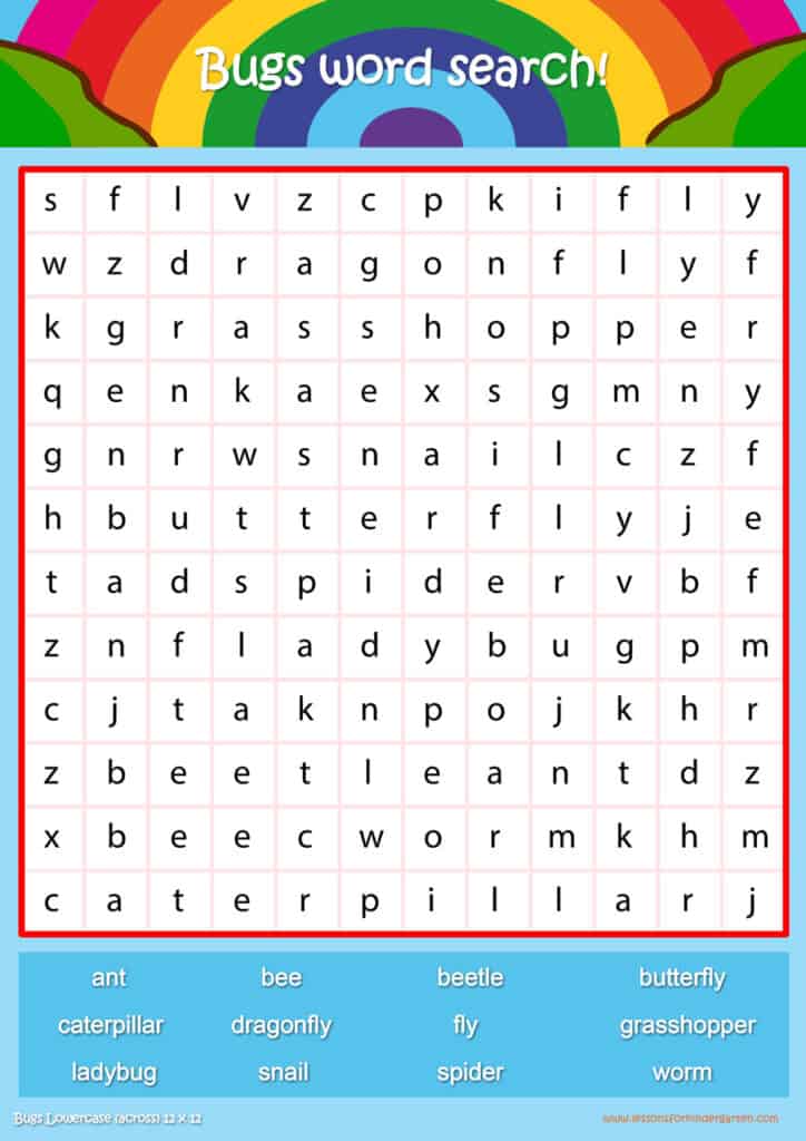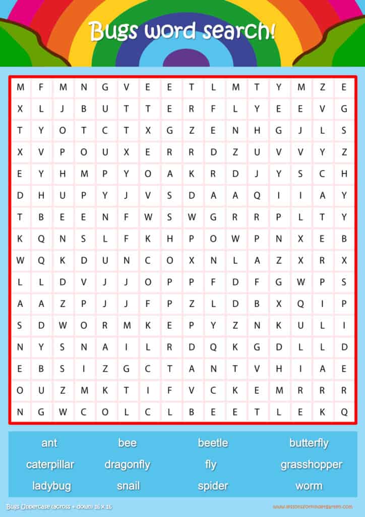 Free bugs word search puzzle sheets for kids! Simply click and download the PDFS for FREE! These bugs word search puzzle sheets are perfect for reinforcing vocabulary your children have learned in your lesson! The worksheets are designed to be used as an activity after teaching your topic’s vocabulary. The bugs word search puzzles help with letter recognition, reading and spelling.