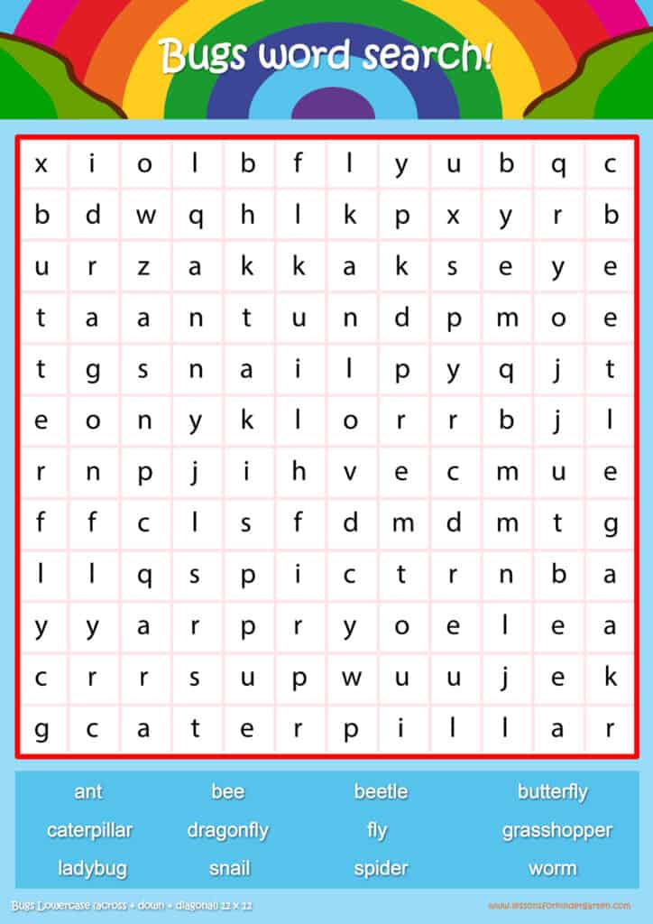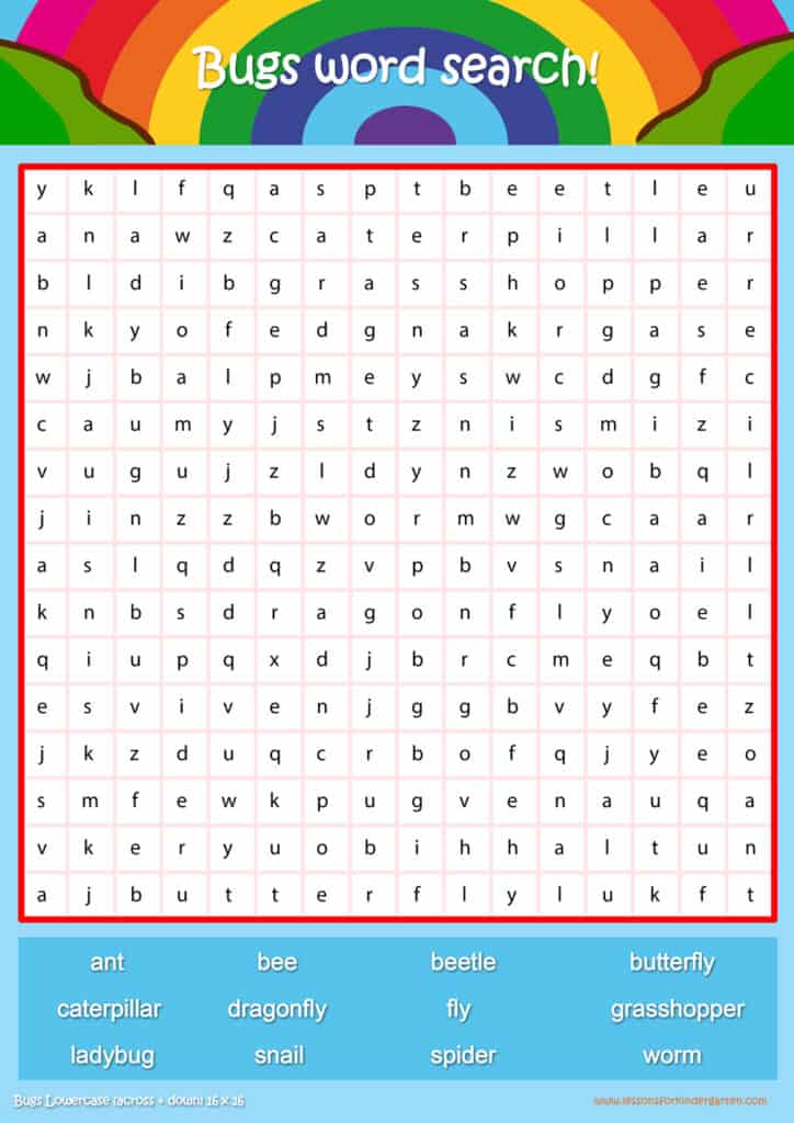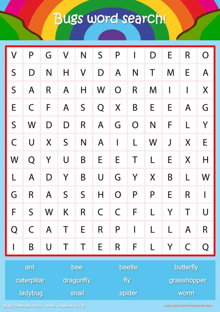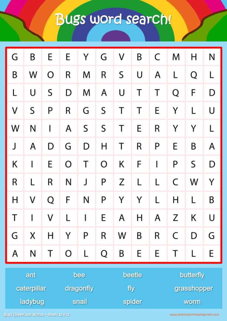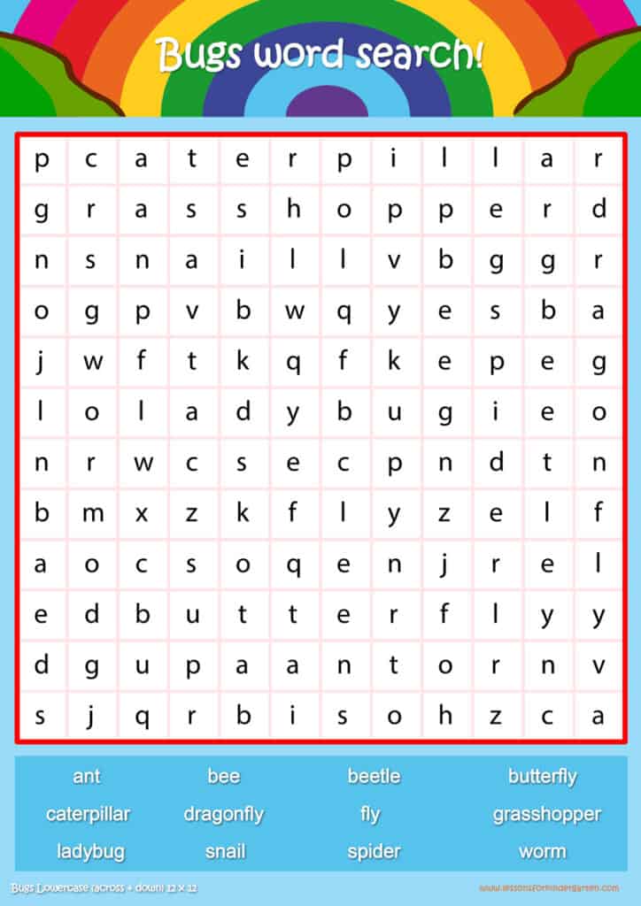 Free bugs word search puzzle sheets for kids! Simply click and download the PDFS for FREE! These bugs word search puzzle sheets are perfect for reinforcing vocabulary your children have learned in your lesson! The worksheets are designed to be used as an activity after teaching your topic’s vocabulary. The bugs word search puzzles help with letter recognition, reading and spelling.