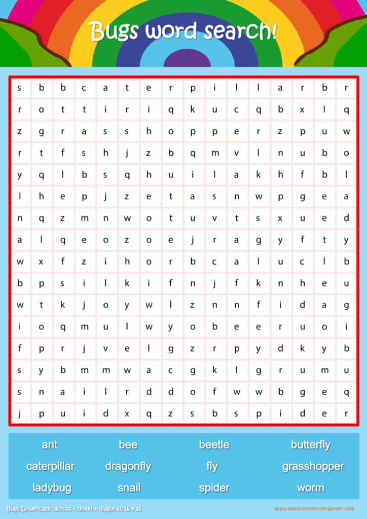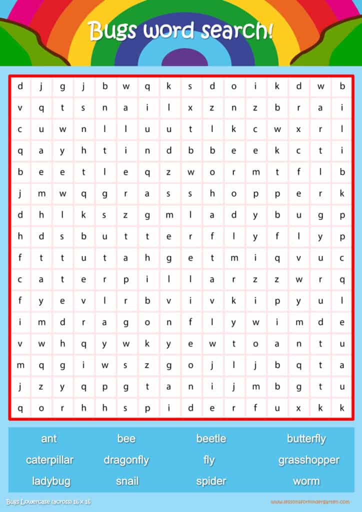 | Bugs Lowercase Word Search Puzzle 16 x 16 | Read 12 Bugs vocabulary words in Lowercase. |