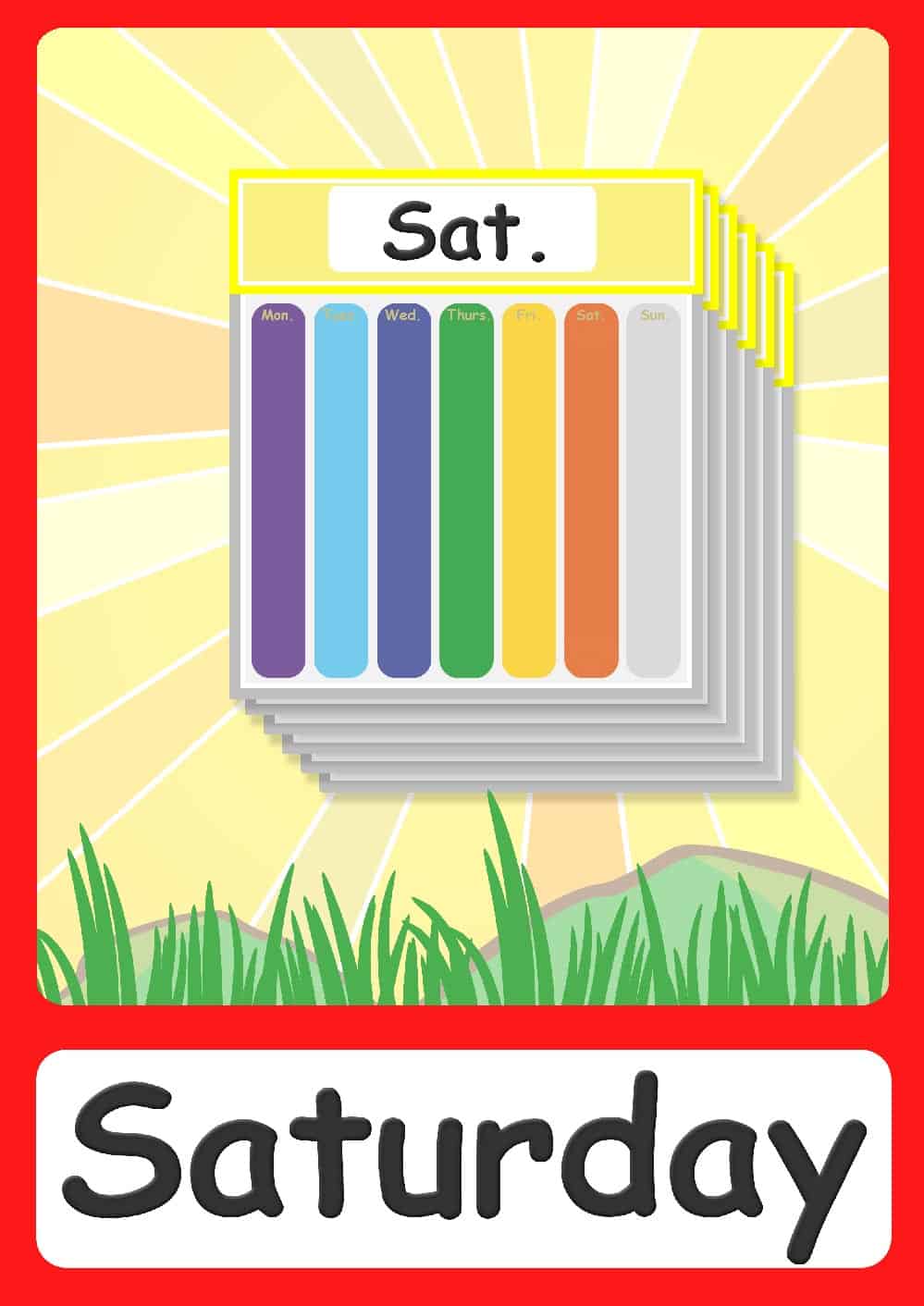 As always, the flashcards come in multiple versions, helping teachers to fully customize their flashcard set depending on their student’s level. The first set comes with the day’s word accompanied by a colorful visual aid in the form of growing grass. This set also has a colorful visual representation of where the day is positioned within the week. Having this visual aid helps students to understand that there are 7 days in each week.