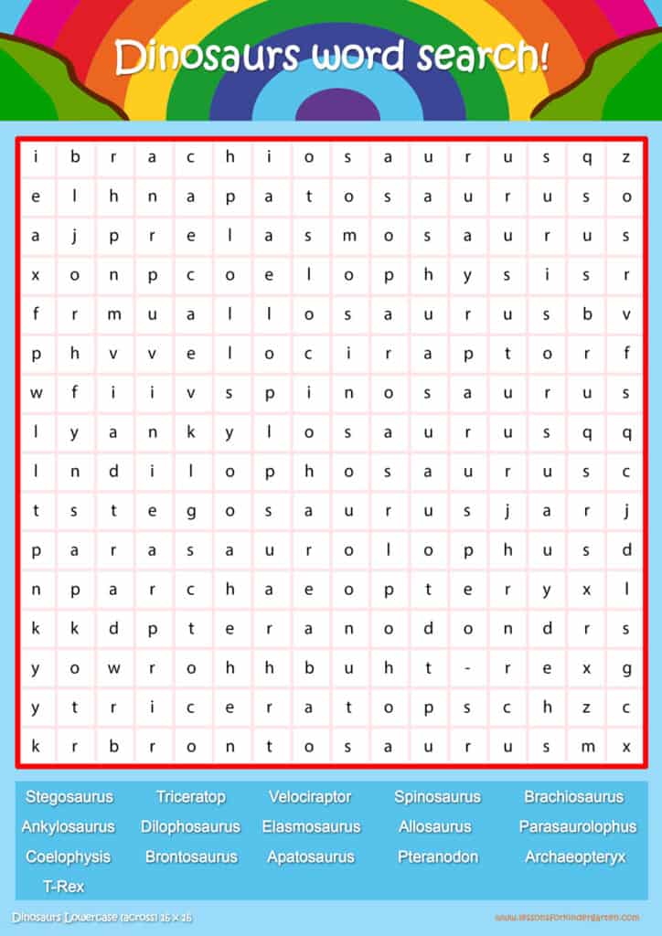 | Dinosaurs Lowercase Word Search Puzzle 16 x 16 | Read 16 Dinosaur vocabulary words in lowercase. |