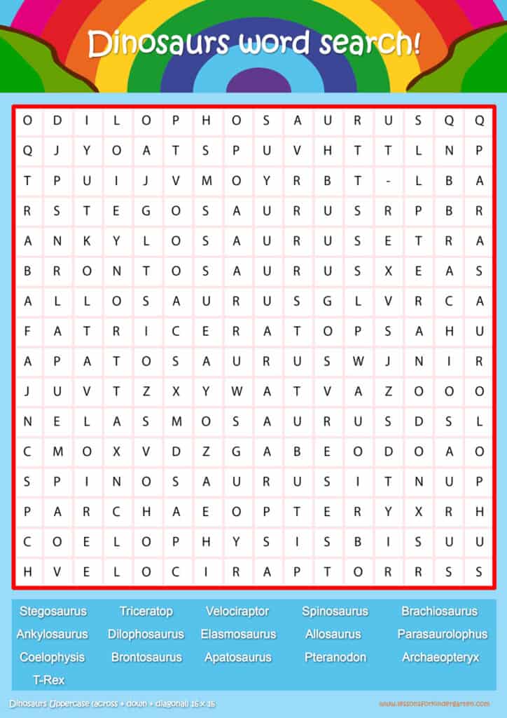 Free dinosaurs word search puzzle sheets for kids! Simply click and download the PDFS for FREE! These dinosaurs word search puzzle sheets are perfect for reinforcing vocabulary your children have learned in your lesson! The worksheets are designed to be used as an activity after teaching your topic’s vocabulary. The dinosaurs word search puzzles help with letter recognition, reading and spelling.