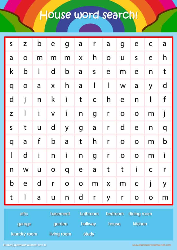 | House Lowercase Word Search Puzzle 12 x 12 | Read 13 house vocabulary words in lowercase |