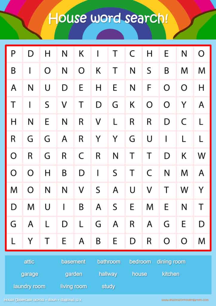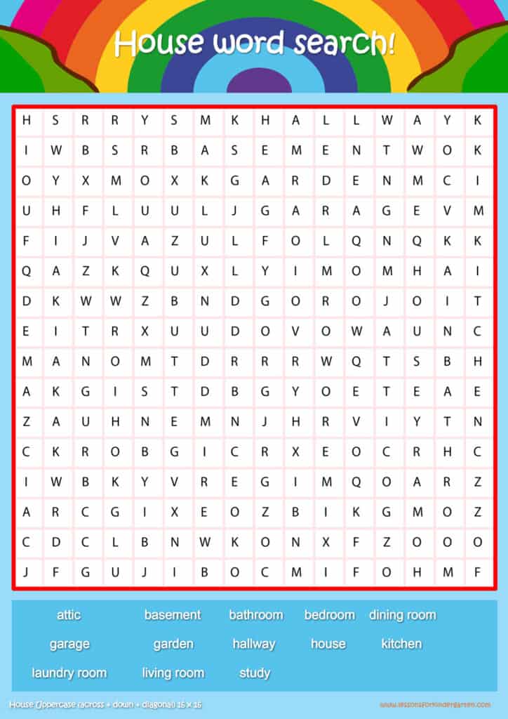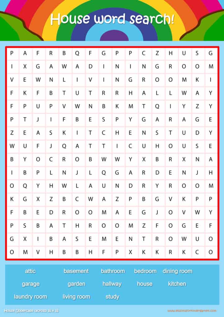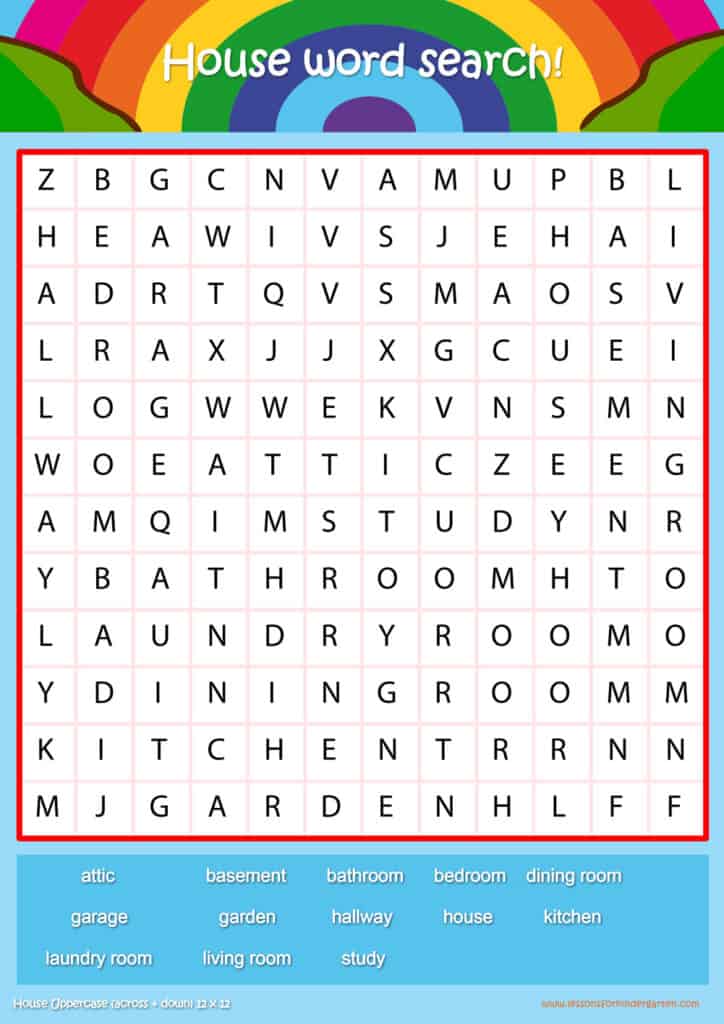 Free house vocabulary word search puzzle sheets for kids! Simply click and download the PDFS for FREE! These house vocabulary word search puzzle sheets are perfect for reinforcing vocabulary your children have learned in your lesson! The worksheets are designed to be used as an activity after teaching your topic’s vocabulary. The house word search puzzles help with letter recognition, reading and spelling.