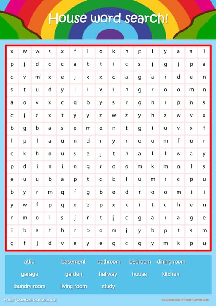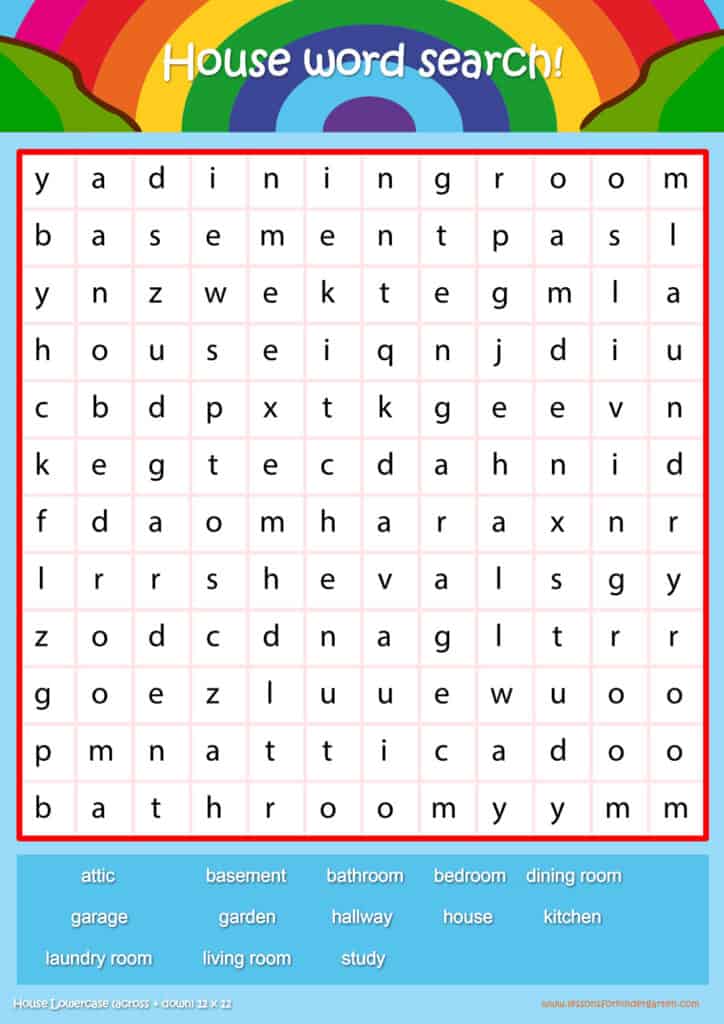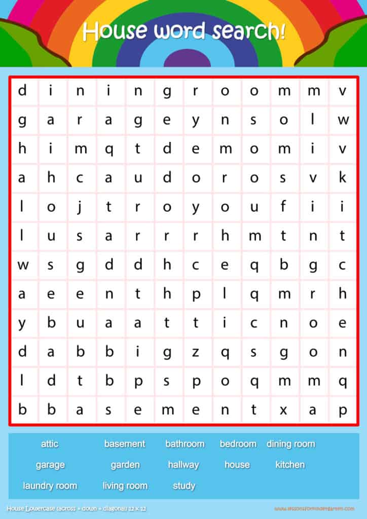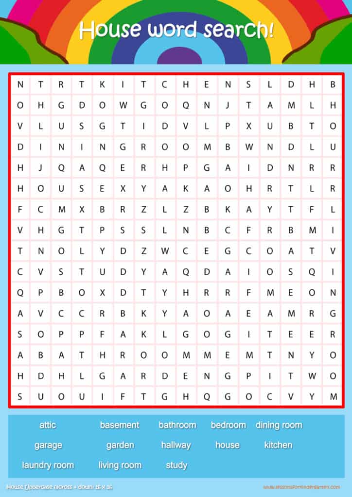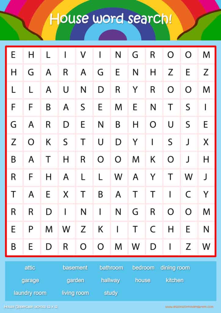 Free house vocabulary word search puzzle sheets for kids! Simply click and download the PDFS for FREE! These house vocabulary word search puzzle sheets are perfect for reinforcing vocabulary your children have learned in your lesson! The worksheets are designed to be used as an activity after teaching your topic’s vocabulary. The house word search puzzles help with letter recognition, reading and spelling.