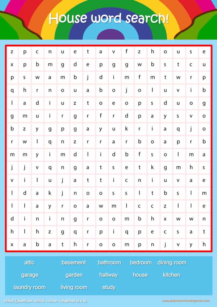 | House Lowercase Word Search Puzzle 16 x 16 | Read 13 house vocabulary words in lowercase |