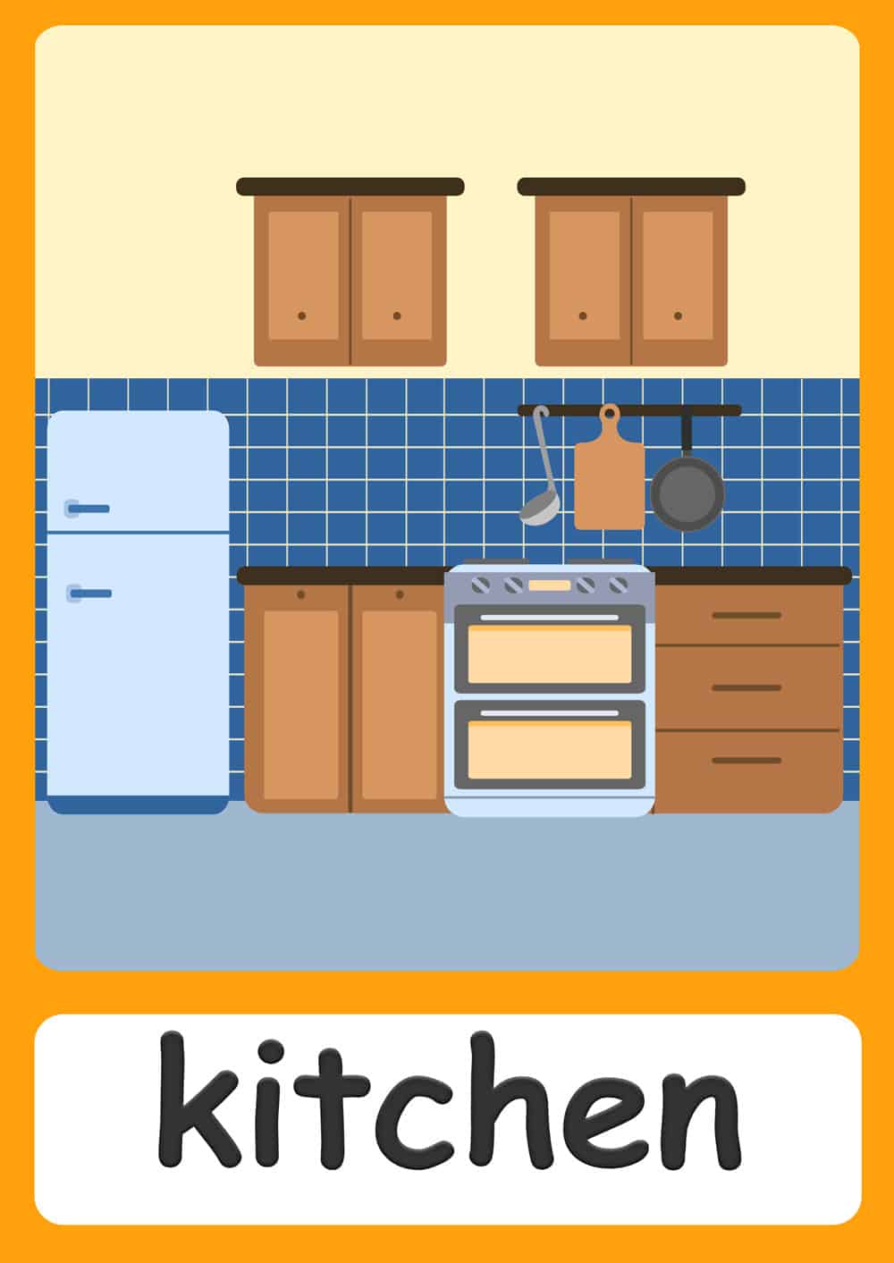 Teach kitchen vocabulary with these 41 kitchen flashcards. If you are teaching about cooking, you can use these flashcards to teach your kids kitchen vocabulary words in advance. Discuss with your students what the items are used for and if they have any of them at home.