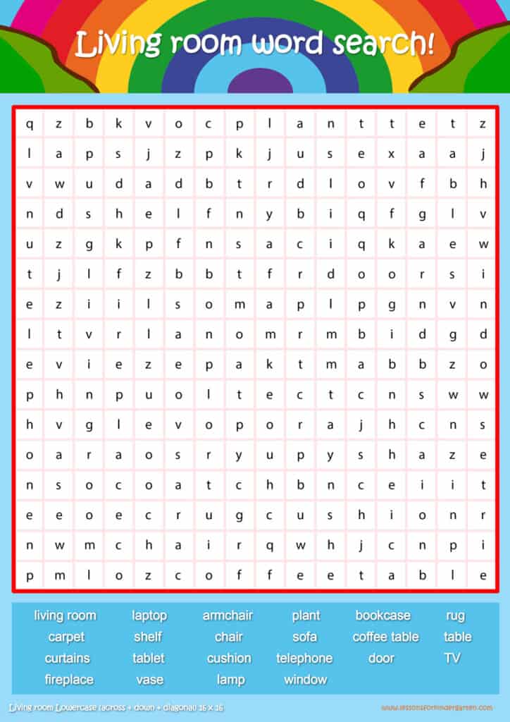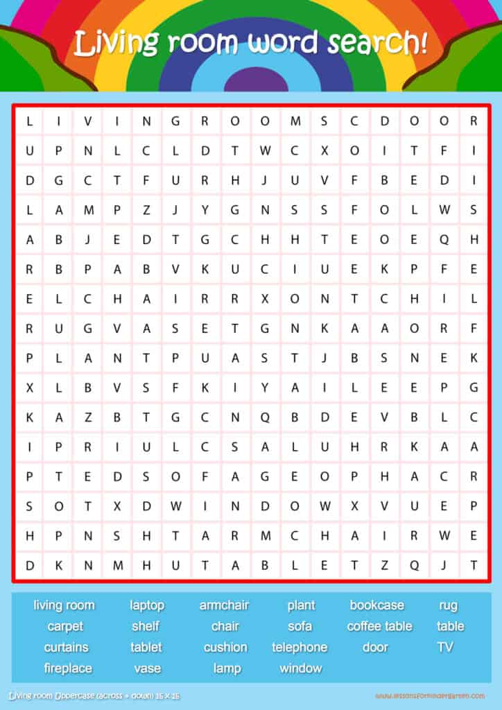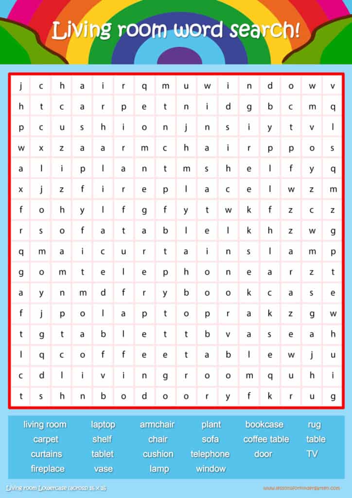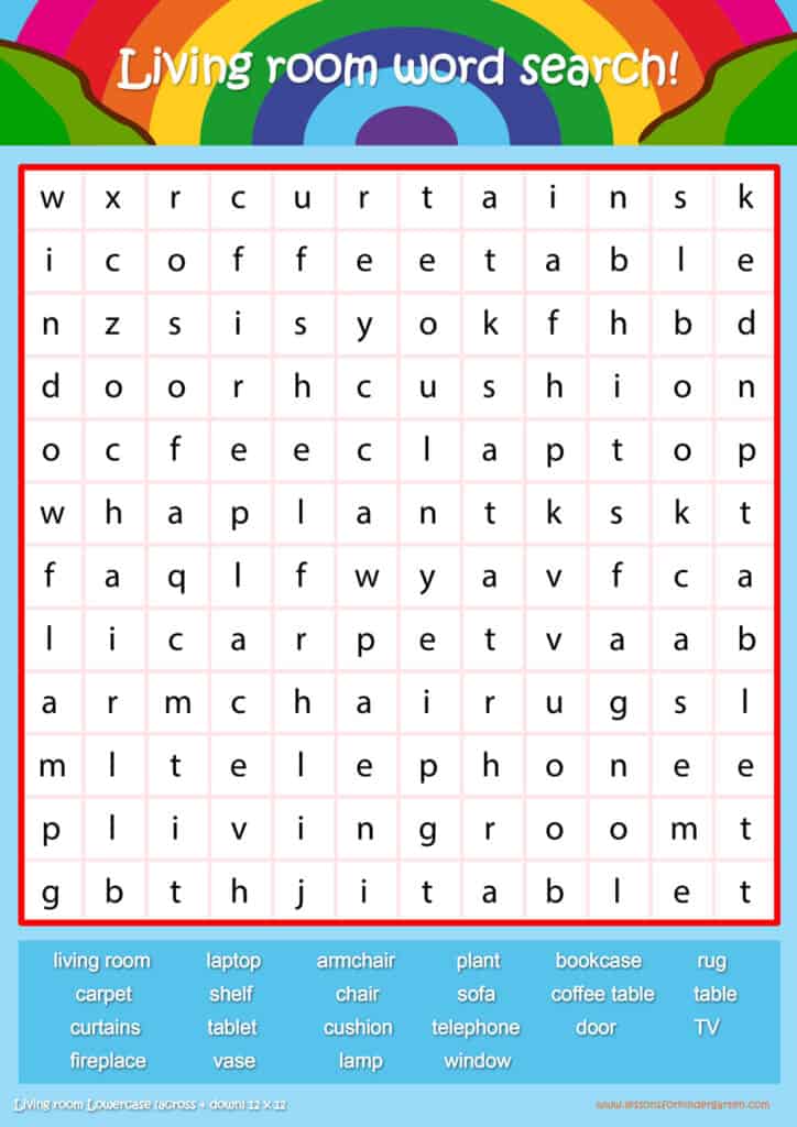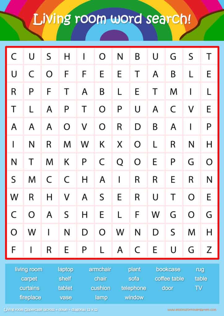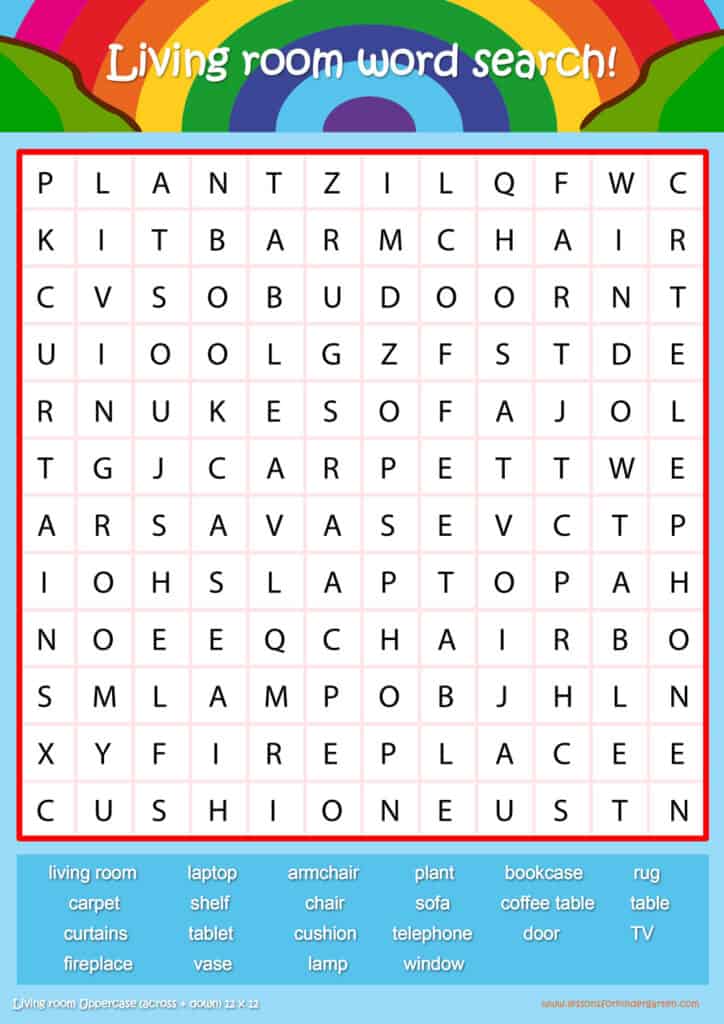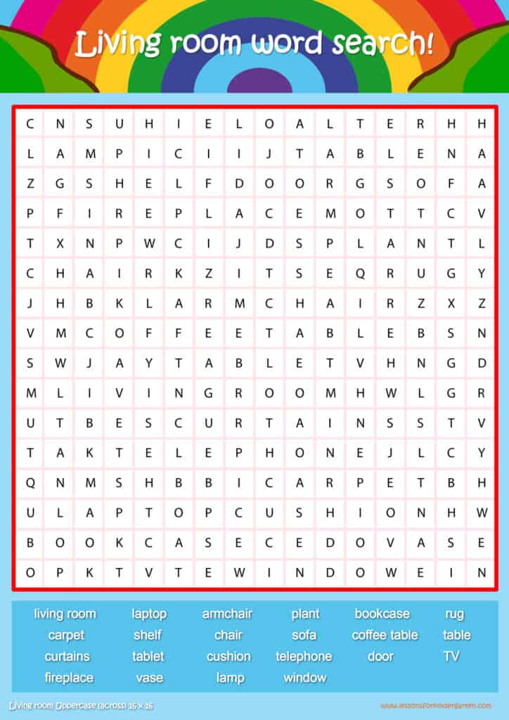 Free living room vocabulary word search puzzle sheets for kids! Simply click and download the PDFS for FREE! These living room vocabulary word search puzzle sheets are perfect for reinforcing vocabulary your children have learned in your lesson! The worksheets are designed to be used as an activity after teaching your topic’s vocabulary. The living room vocabulary word search puzzles help with letter recognition, reading and spelling.