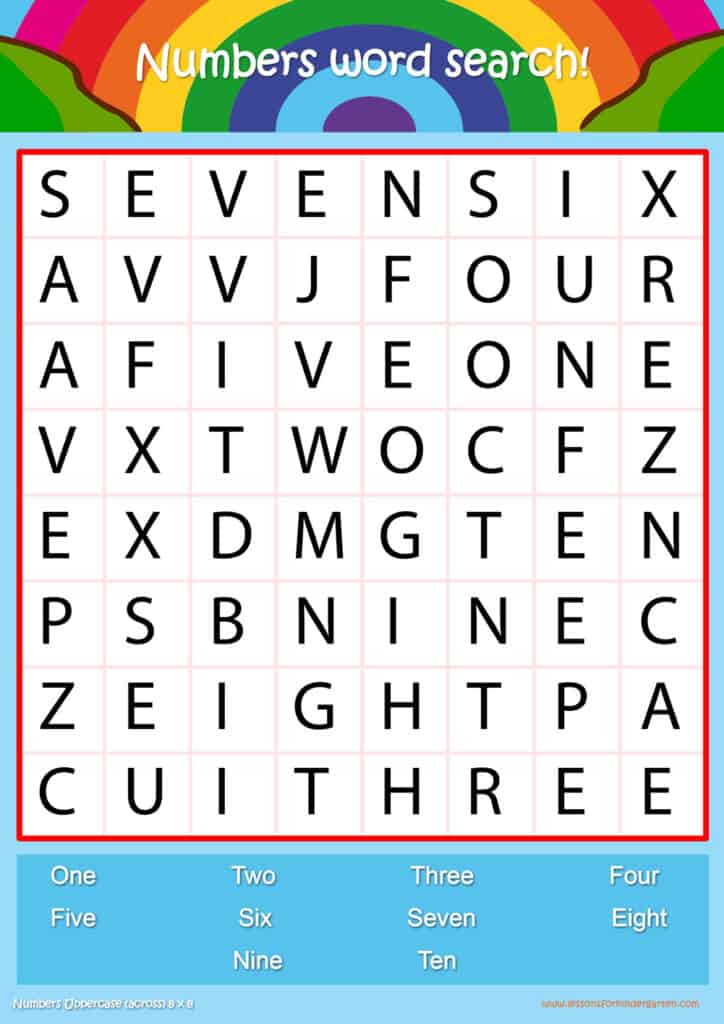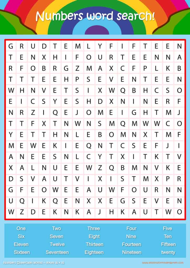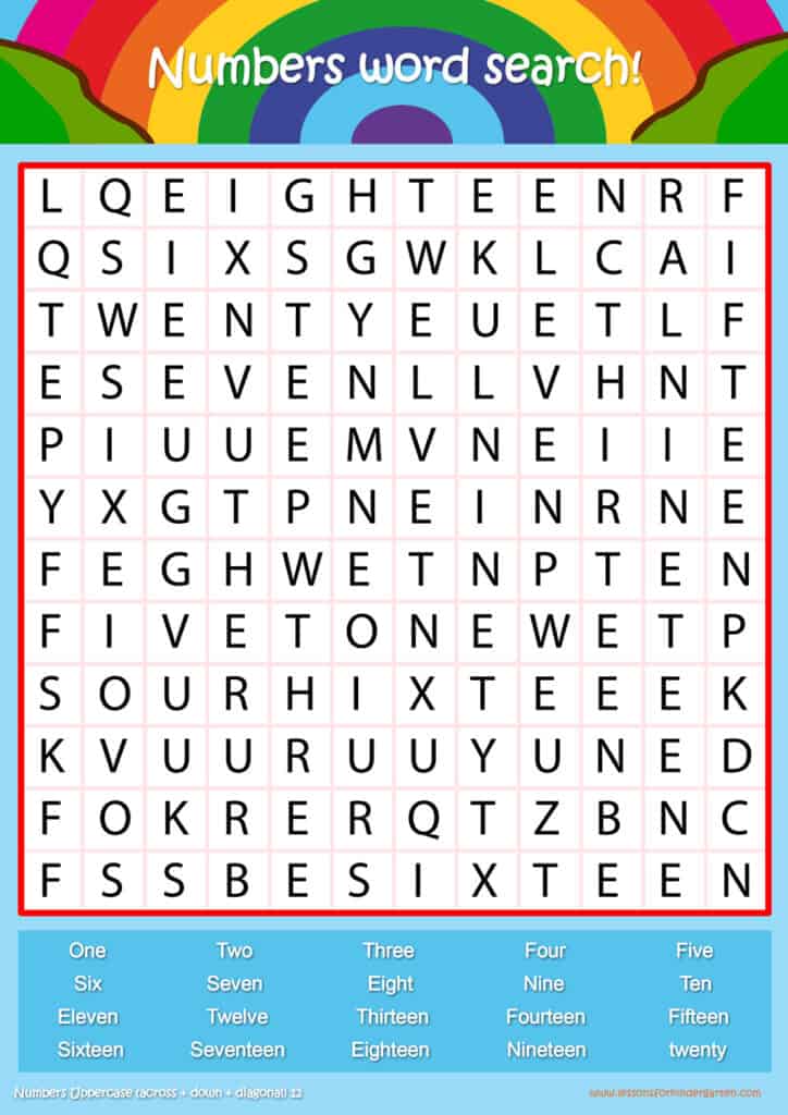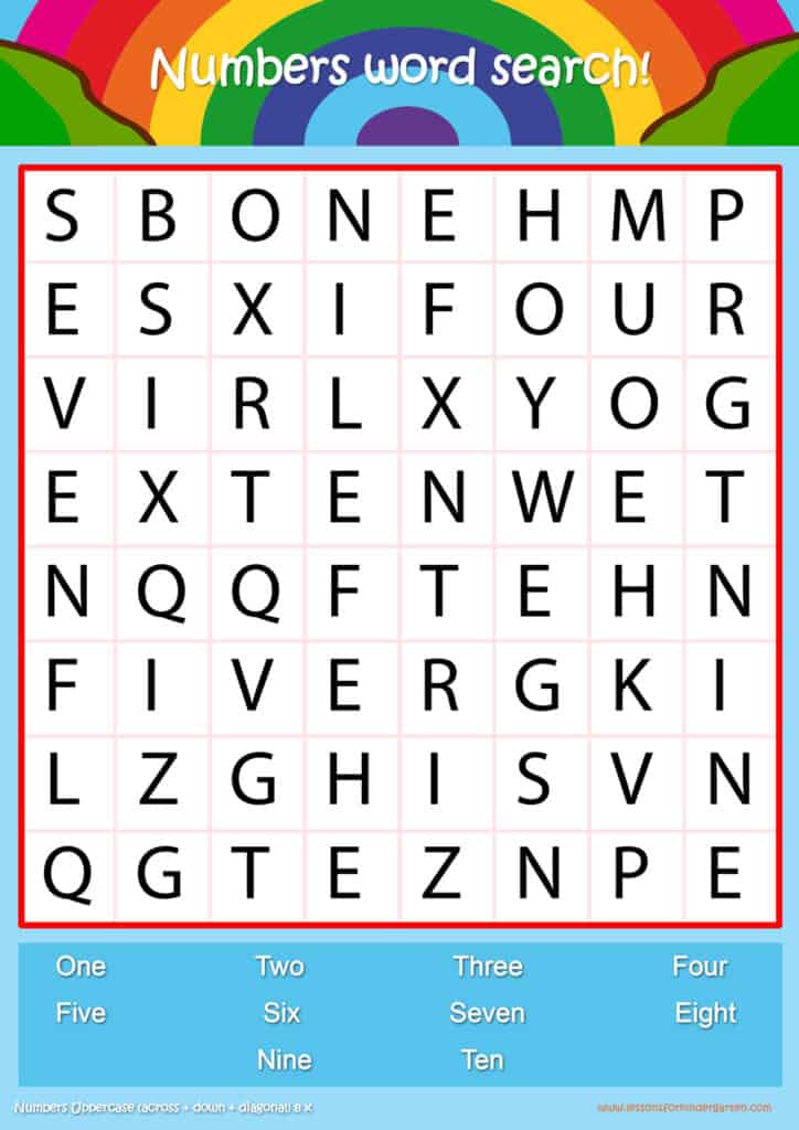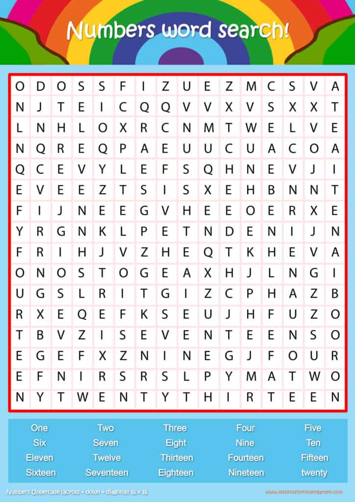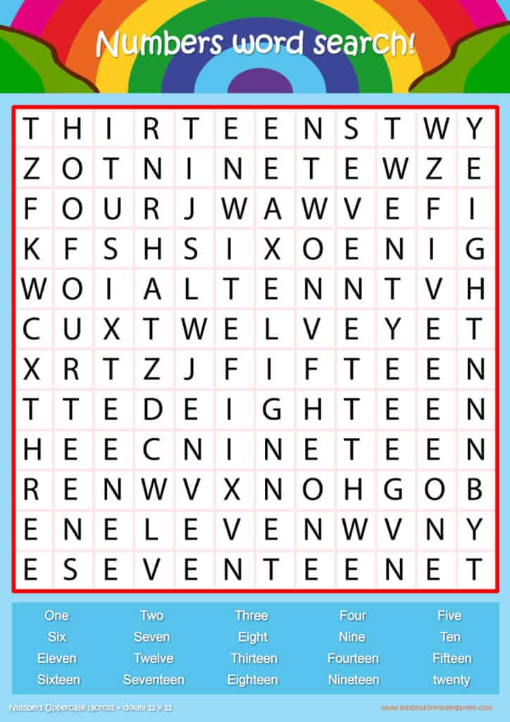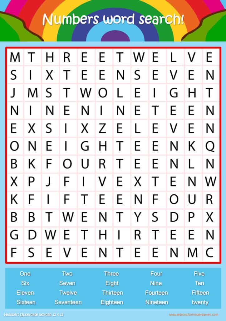 Free number word search puzzle sheets for kids! Simply click and download the PDFS for FREE! These number word search puzzle sheets are perfect for reinforcing vocabulary your children have learned in your lesson! The worksheets are designed to be used as an activity after teaching your topic’s vocabulary. The number word search puzzles help with letter recognition, reading and spelling.