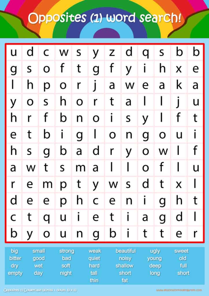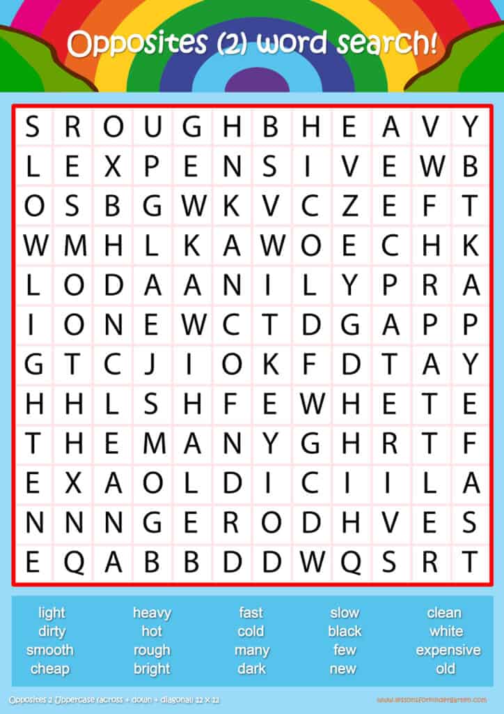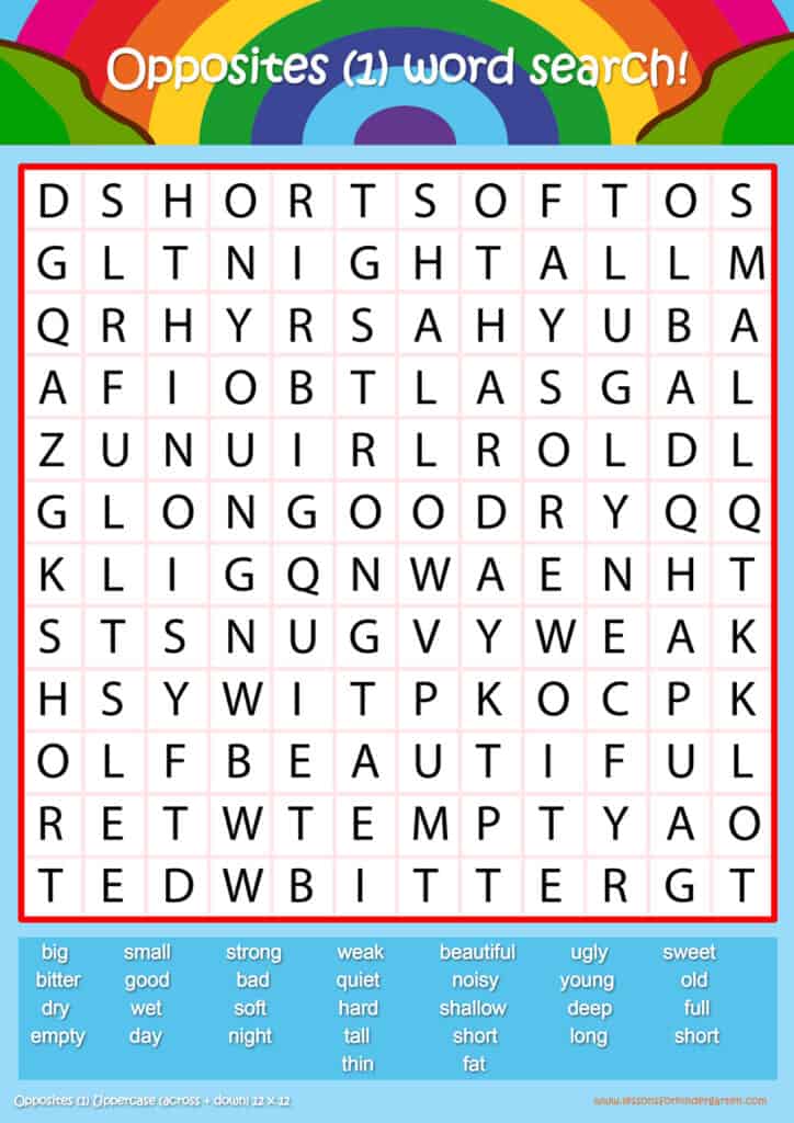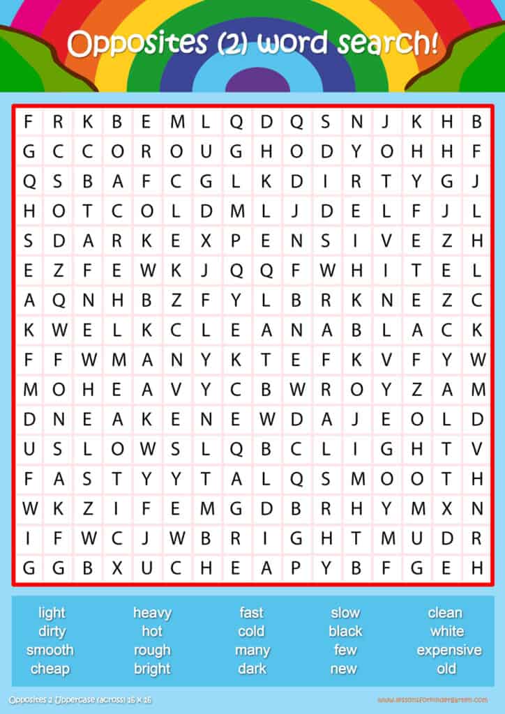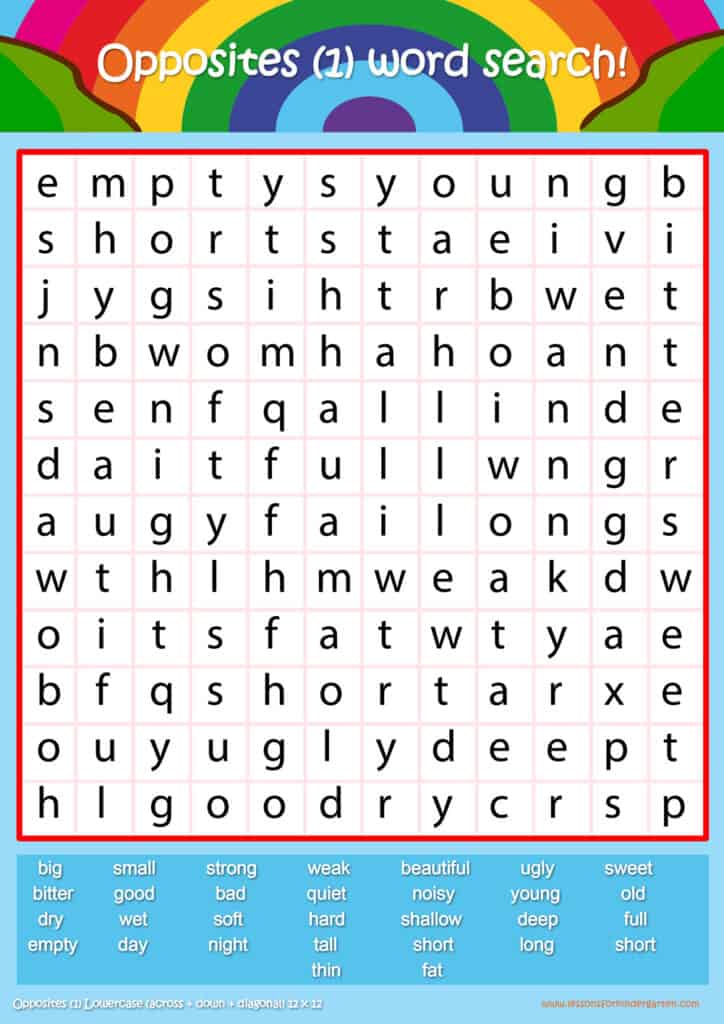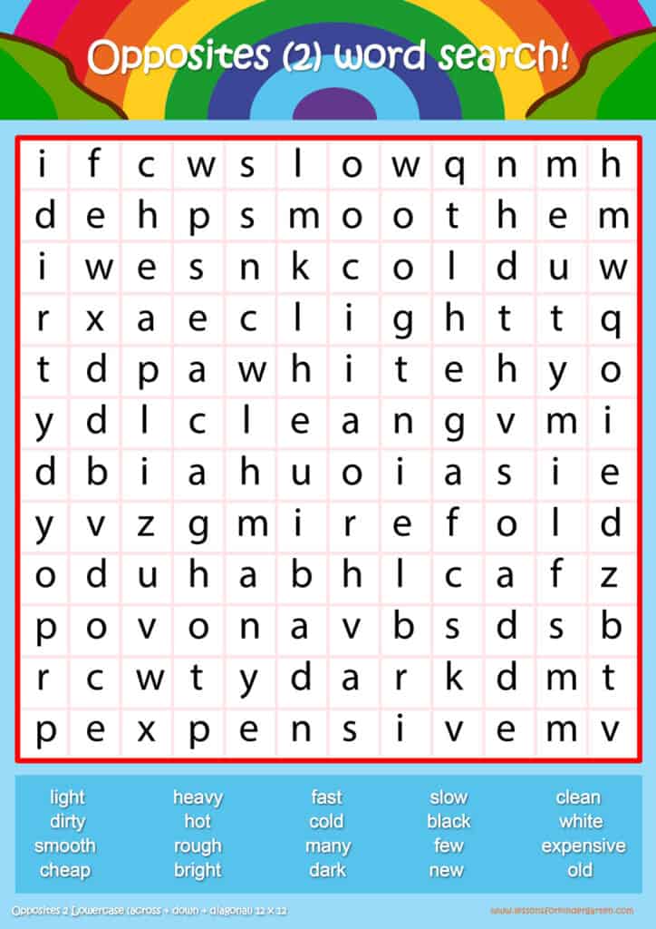 Free opposites word search puzzle sheets for kids! Simply click and download the PDFS for FREE! These opposites word search puzzle sheets are perfect for reinforcing vocabulary your children have learned in your lesson! The worksheets are designed to be used as an activity after teaching your topic’s vocabulary. The opposites word search puzzles help with letter recognition, reading and spelling.