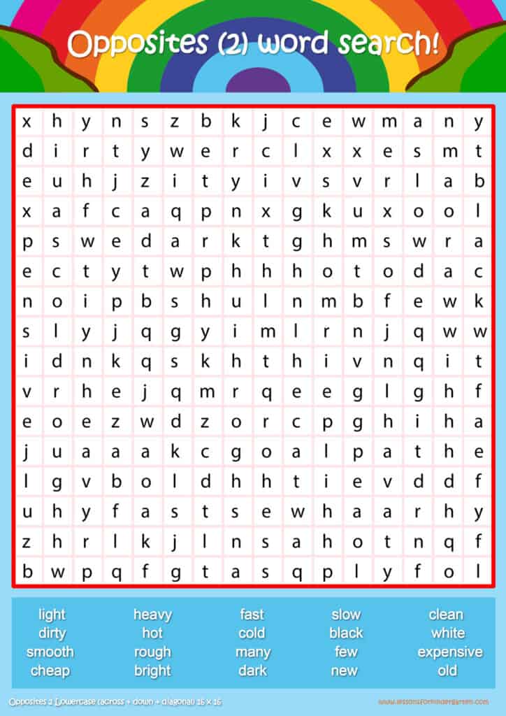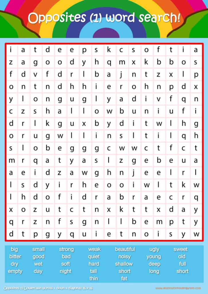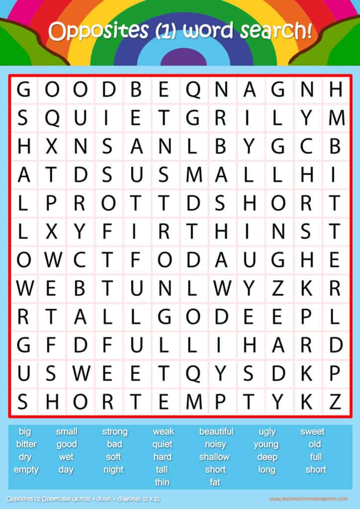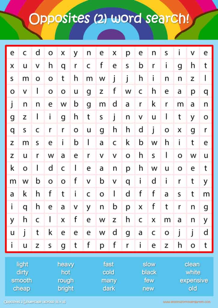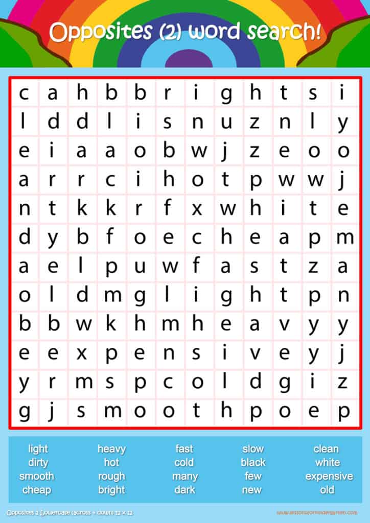 Free opposites word search puzzle sheets for kids! Simply click and download the PDFS for FREE! These opposites word search puzzle sheets are perfect for reinforcing vocabulary your children have learned in your lesson! The worksheets are designed to be used as an activity after teaching your topic’s vocabulary. The opposites word search puzzles help with letter recognition, reading and spelling.