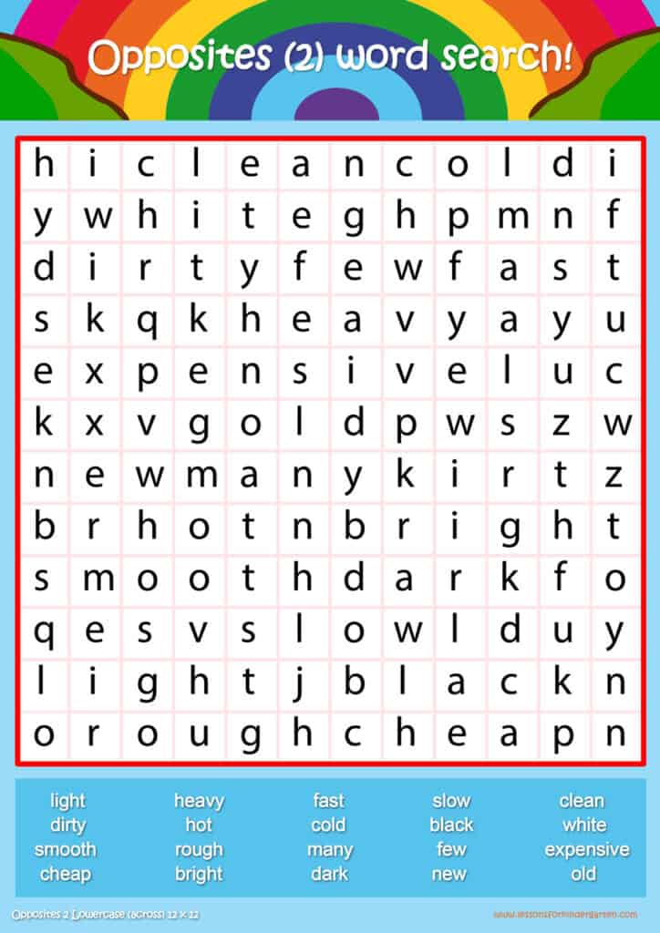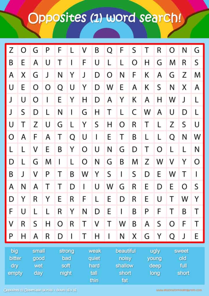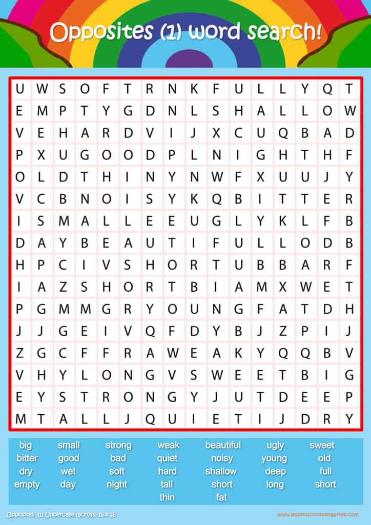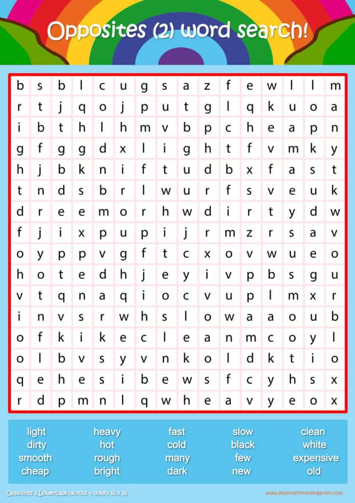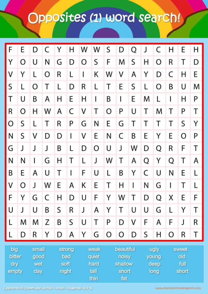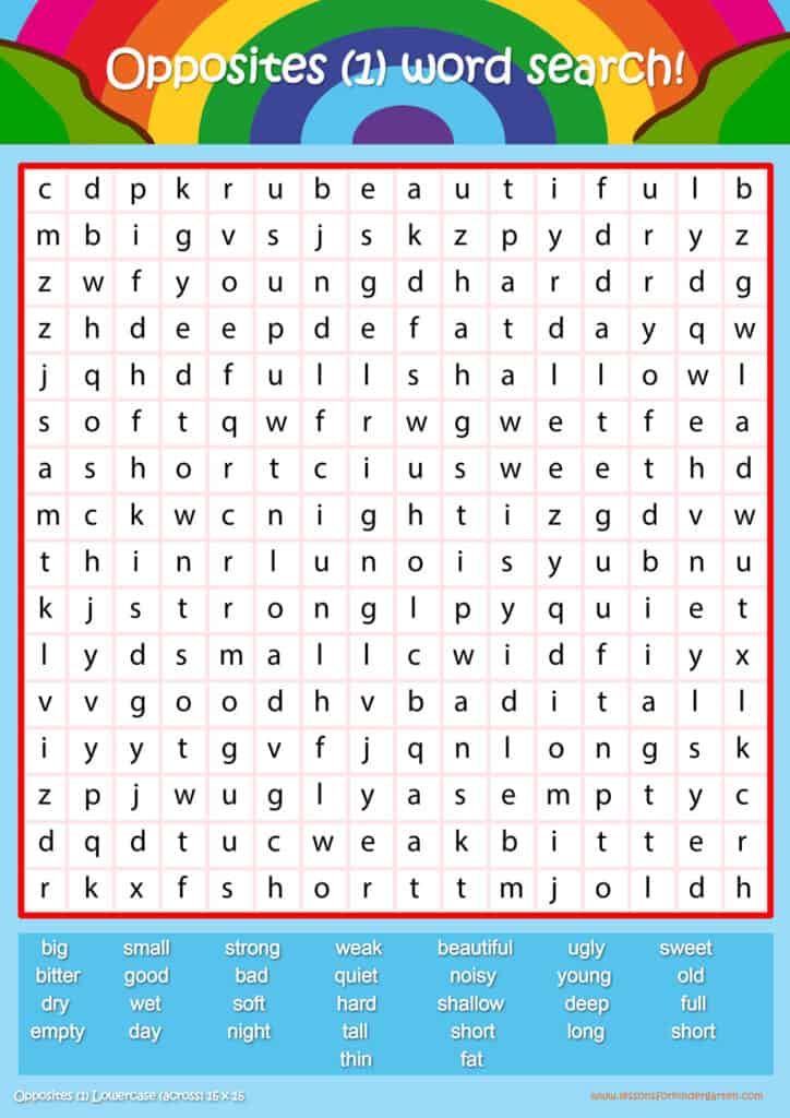 Free opposites word search puzzle sheets for kids! Simply click and download the PDFS for FREE! These opposites word search puzzle sheets are perfect for reinforcing vocabulary your children have learned in your lesson! The worksheets are designed to be used as an activity after teaching your topic’s vocabulary. The opposites word search puzzles help with letter recognition, reading and spelling.