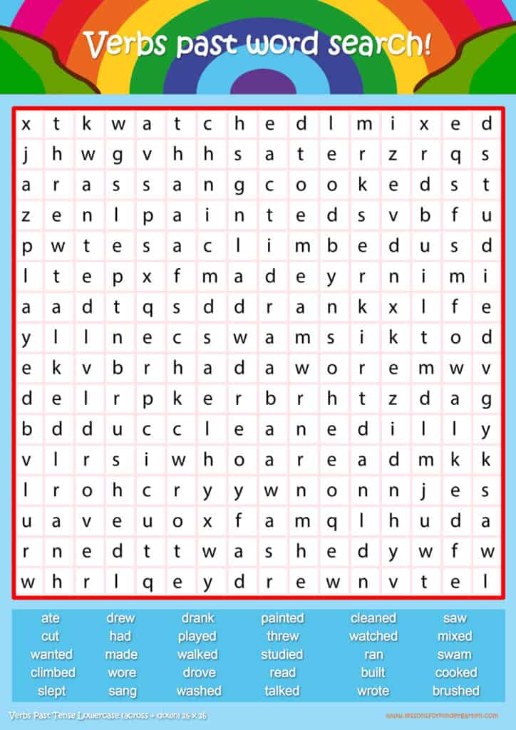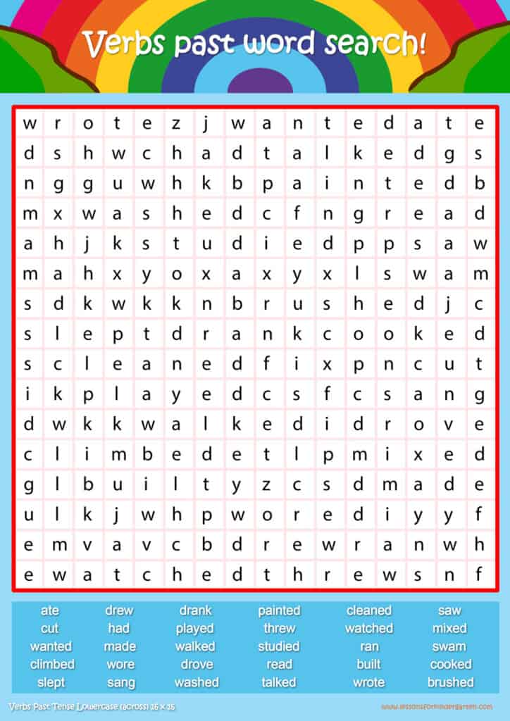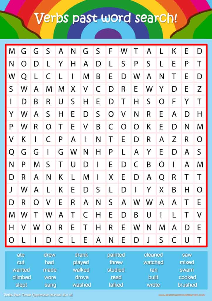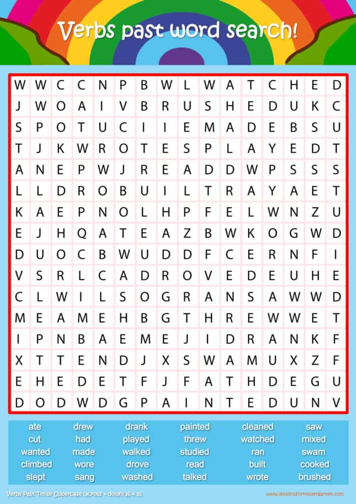 Free past tense word search puzzle sheets for kids! Simply click and download the PDFS for FREE! These past tense word search puzzle sheets are perfect for reinforcing vocabulary your children have learned in your lesson! The worksheets are designed to be used as an activity after teaching your topic’s vocabulary. The past tense word search puzzles help with letter recognition, reading and spelling.