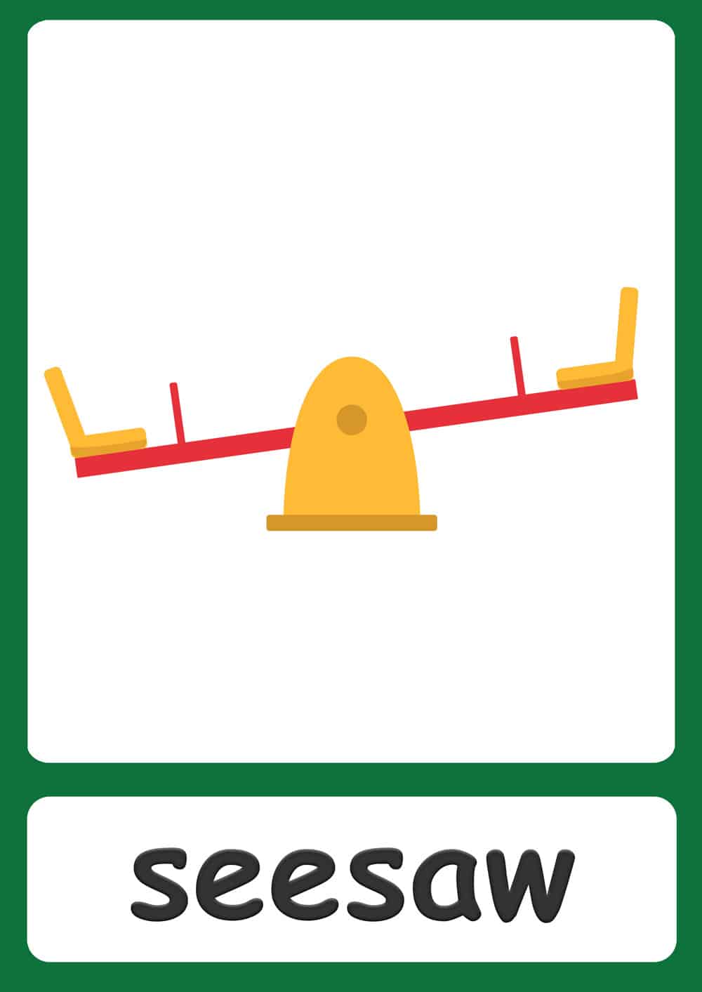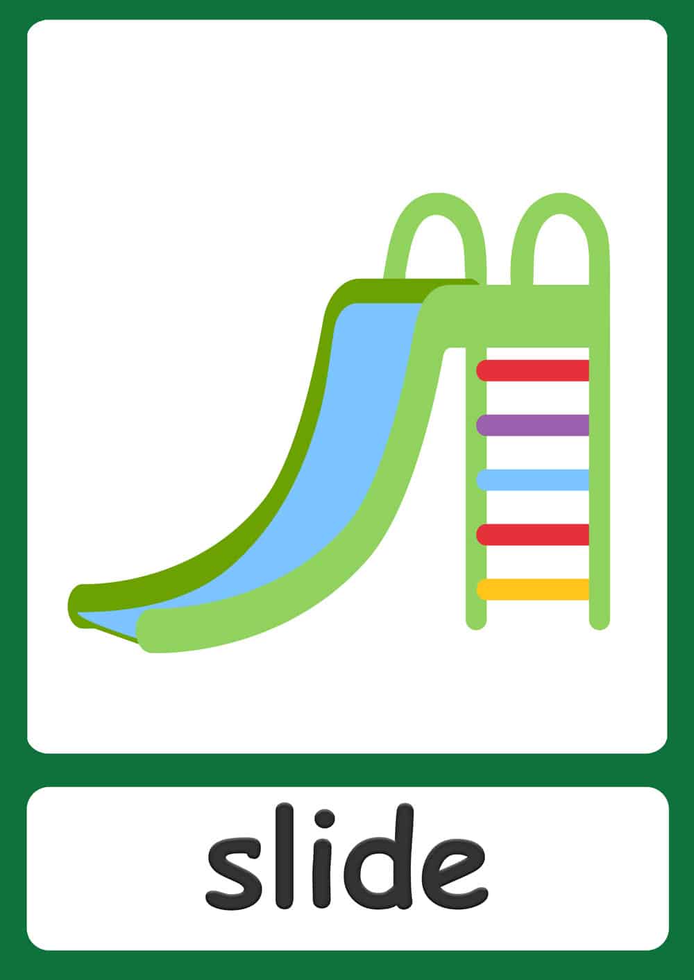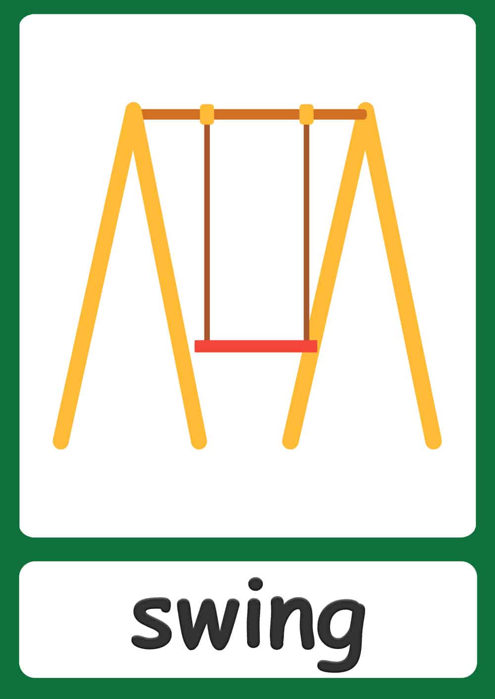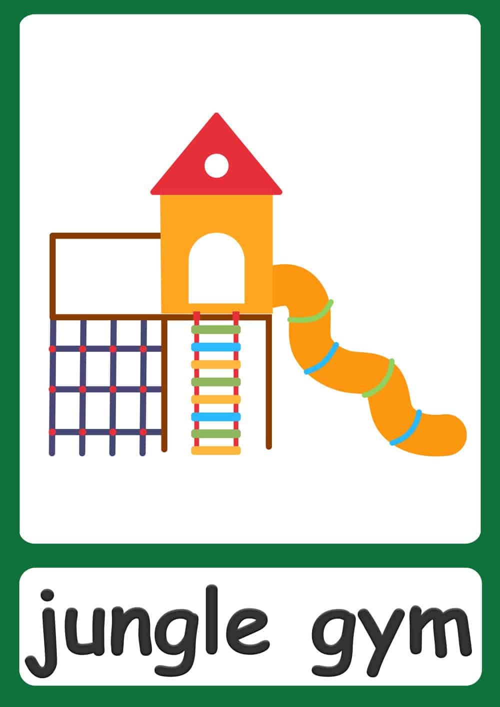 Do you take your children to the park? Why not teach them playground vocabulary words with these 14 playground flashcards. Talk about what things are available at the local park and talk about what they enjoy at the playground.