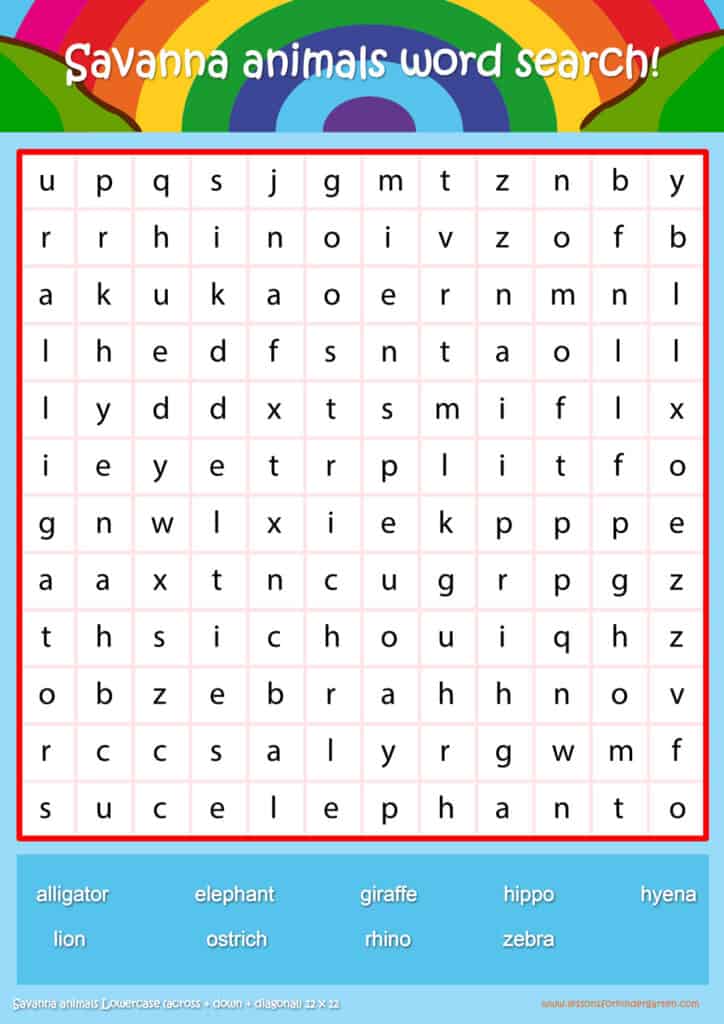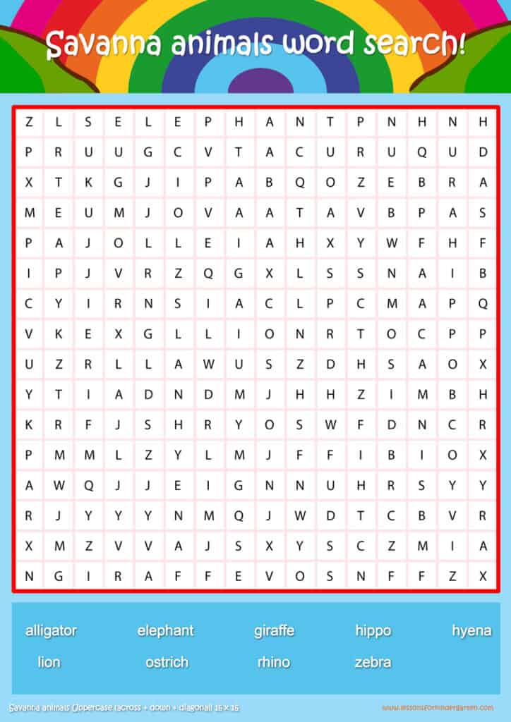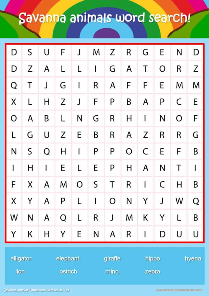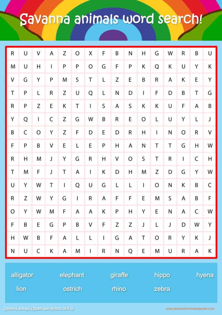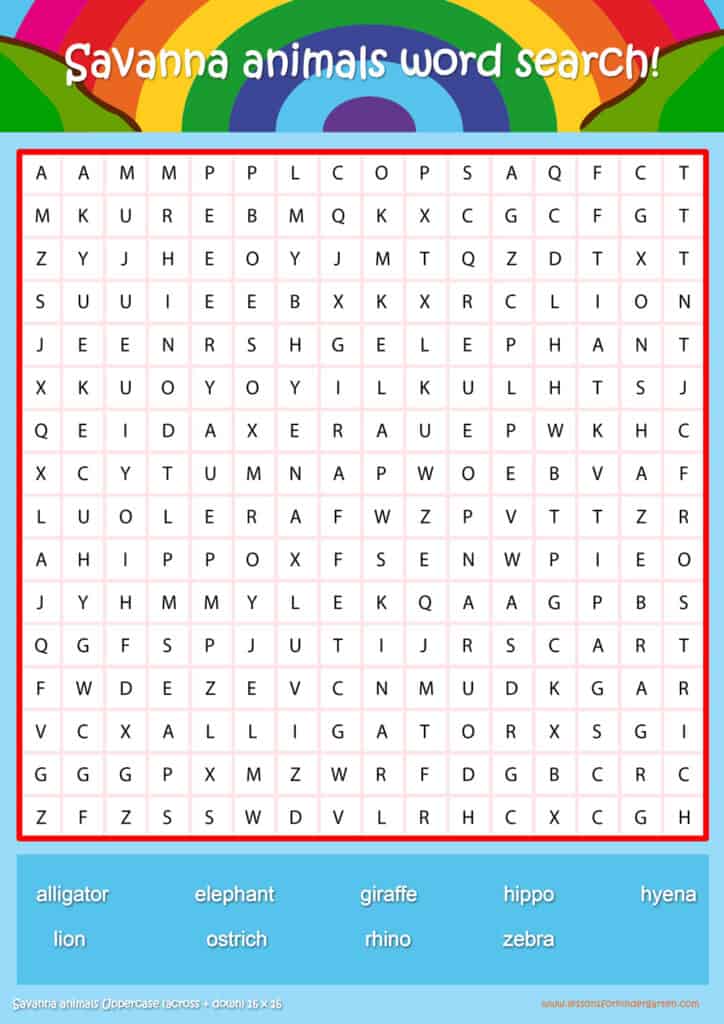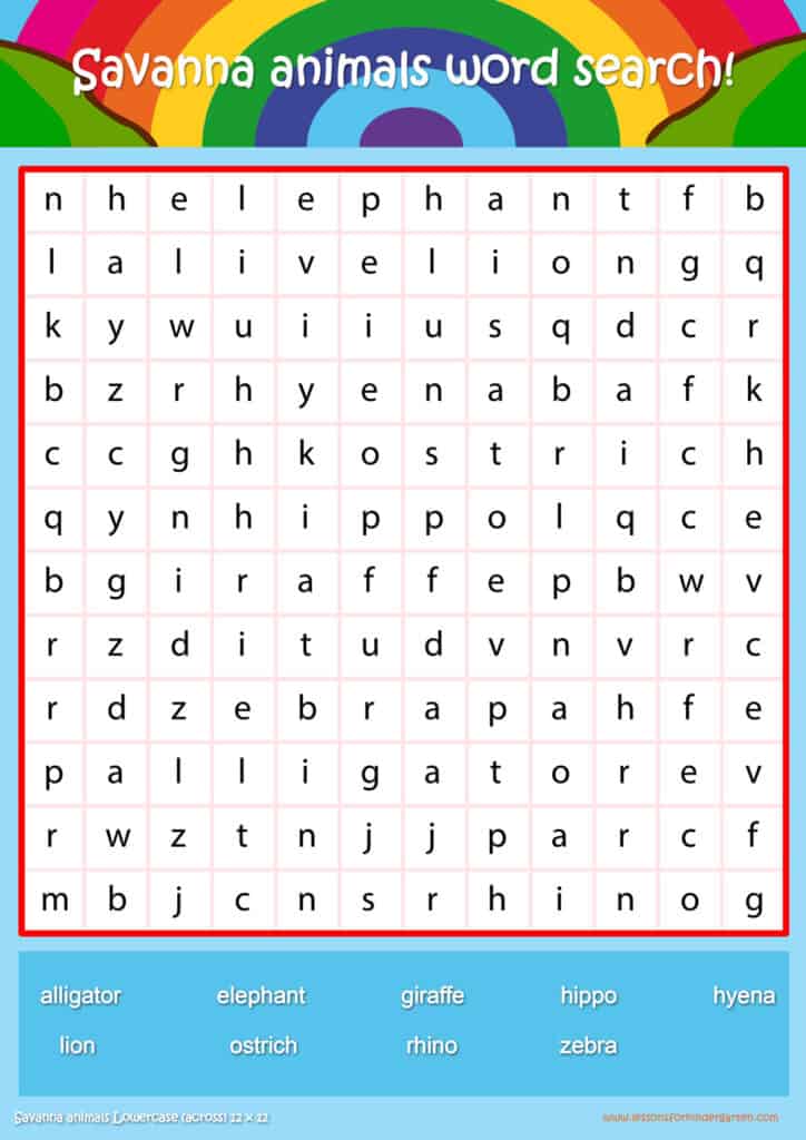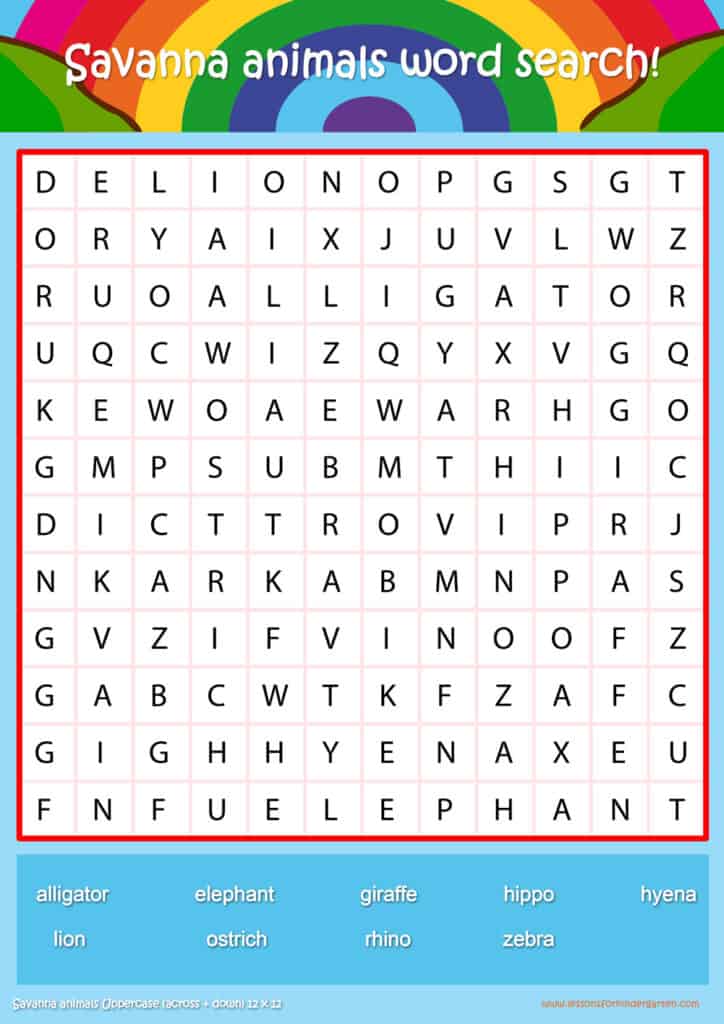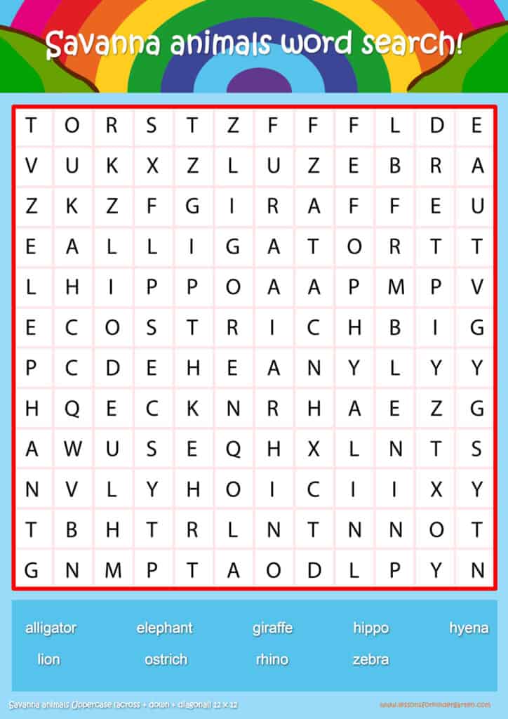Free savanna animals word search puzzle sheets for kids! Simply click and download the PDFS for FREE! These savanna animals word search puzzle sheets are perfect for reinforcing vocabulary your children have learned in your lesson! The worksheets are designed to be used as an activity after teaching your topic’s vocabulary. The savanna animals word search puzzles help with letter recognition, reading and spelling.