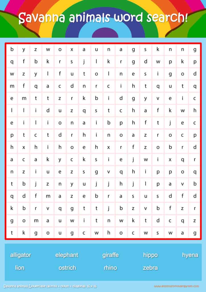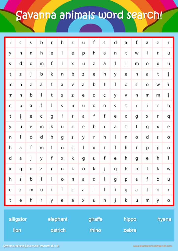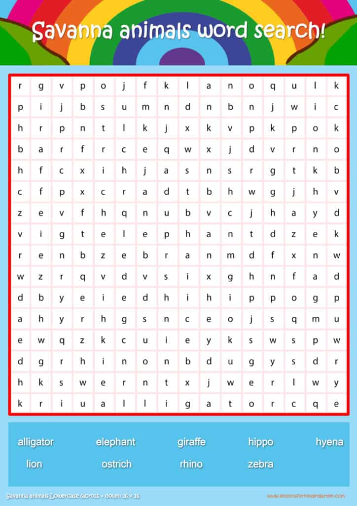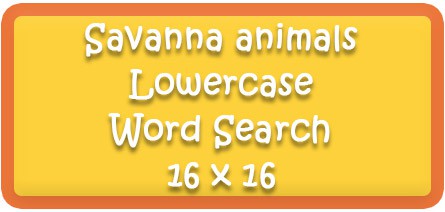 | Savanna animals Lowercase Word Search Puzzle 16 x16 | Read 9 savanna animal vocabulary words in lowercase |
