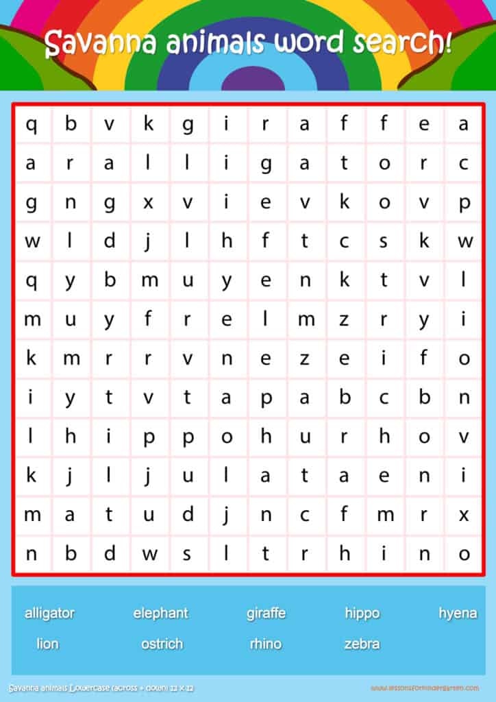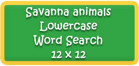 | Savanna animals Lowercase Word Search Puzzle 12 x12 | Read 9 savanna animal vocabulary words in lowercase |