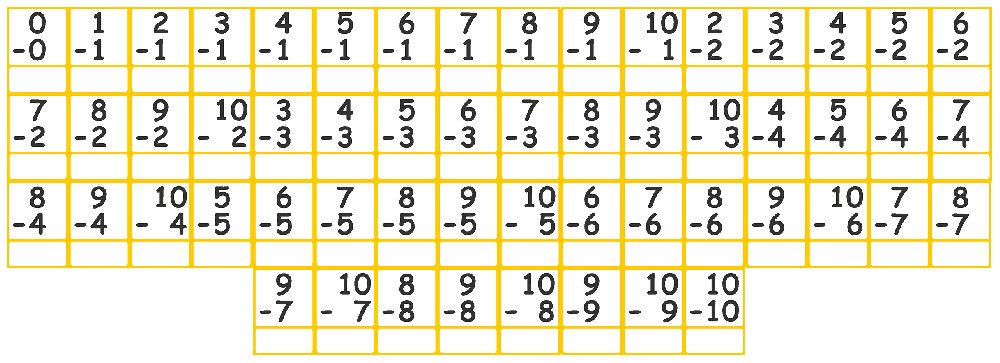 | 0 – 0 = 0 | 5 – 2 = 3 | 4 – 4 = 0 | 7 – 6 = 1 |