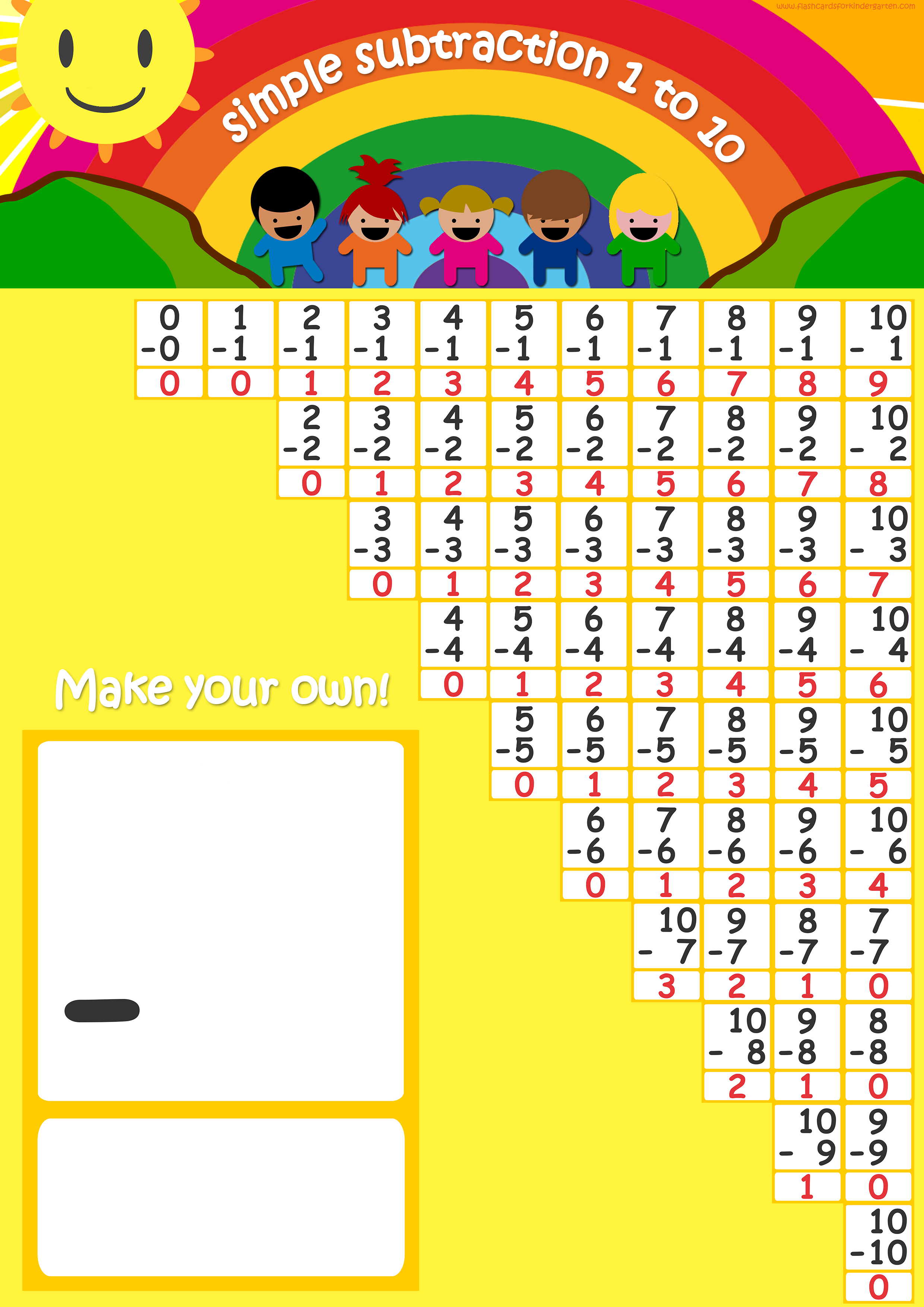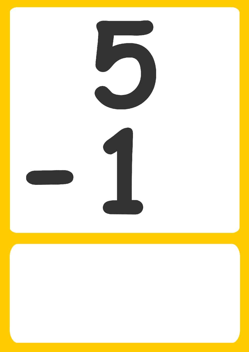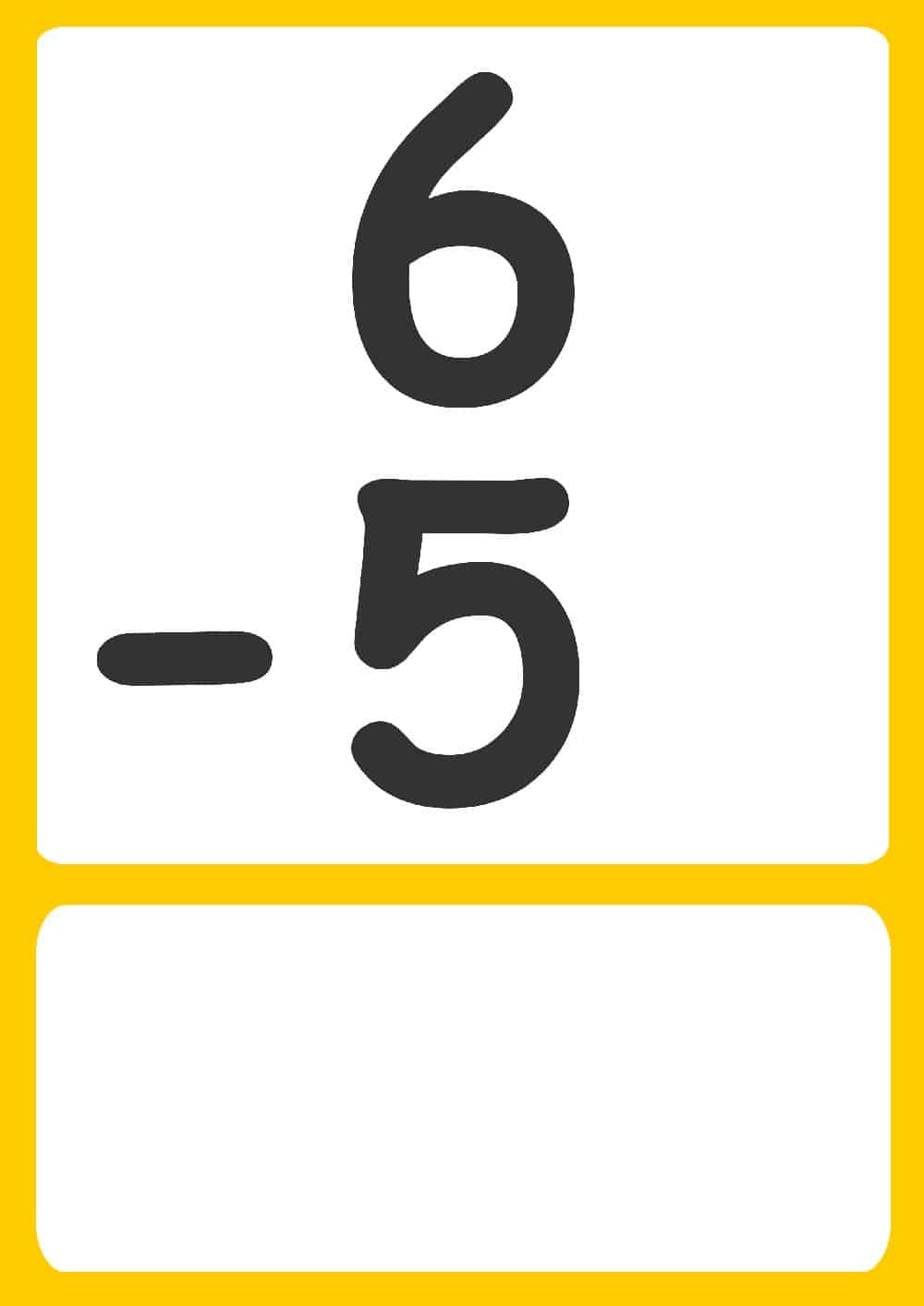 Pack 1 contains simple subtraction flashcards without answers. After the flashcards have been laminated, flashcards can be filled in by the student or teacher using a water-based whiteboard marker. Introduce the math cards at an easy pace. Once your students have grasped the concept of subtraction, try to give each student a card and ask them what they think the answer is.