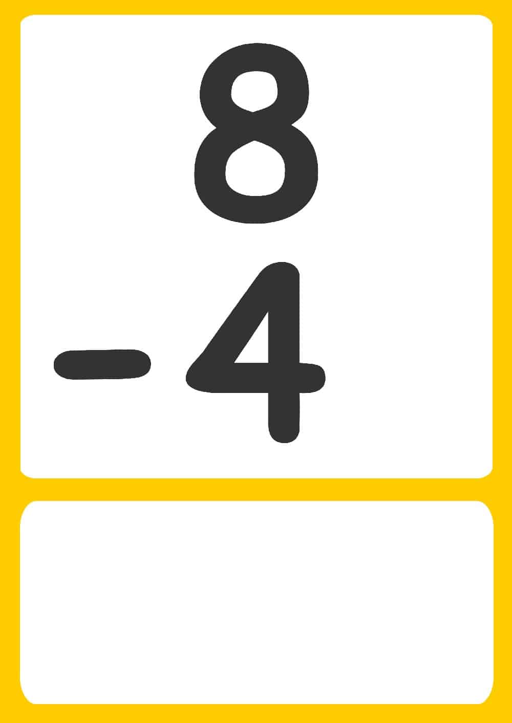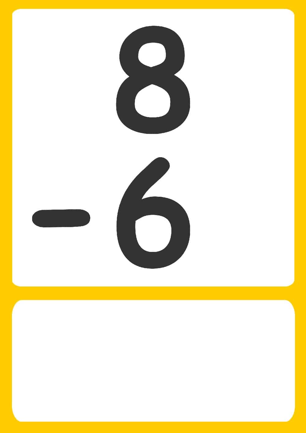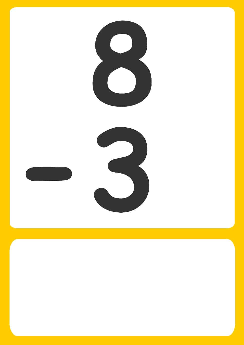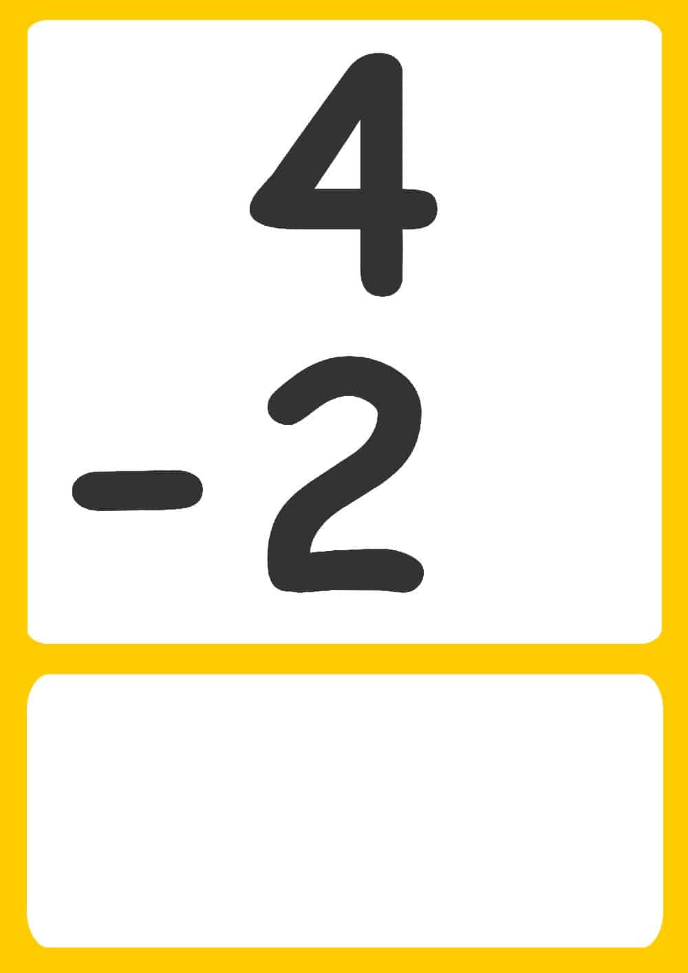 Pack 2 contains subtraction flashcards complete with answers. The answer can be covered by the teacher and the children can guess what the answer is. Another great way to use them is to cut the answer off the bottom of the card and have the children match them up!