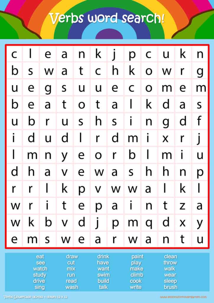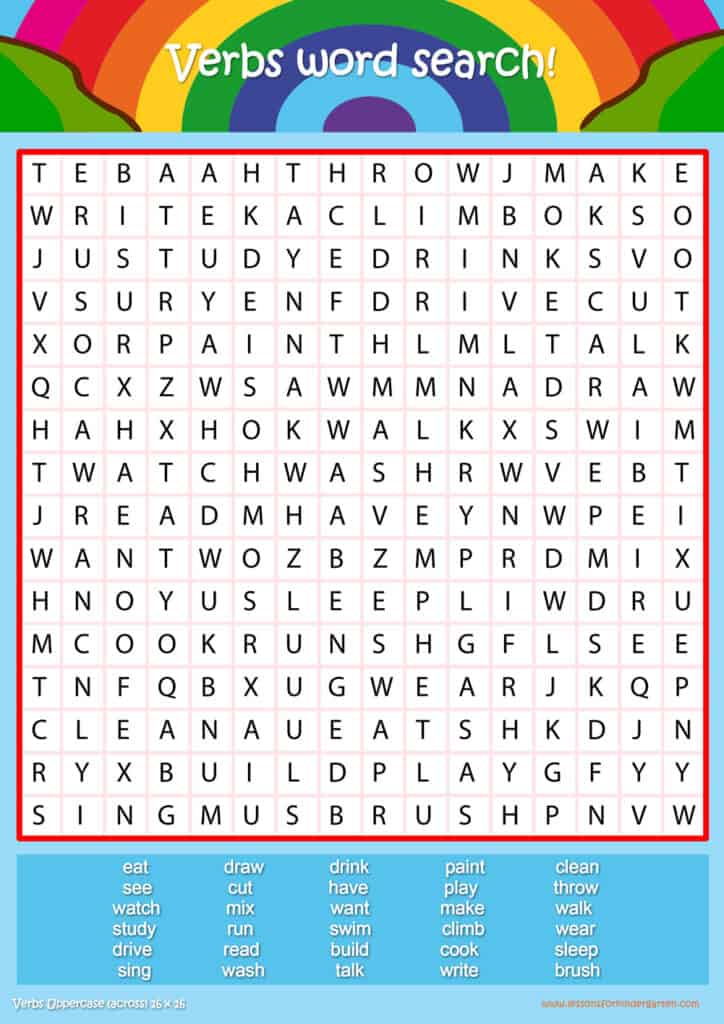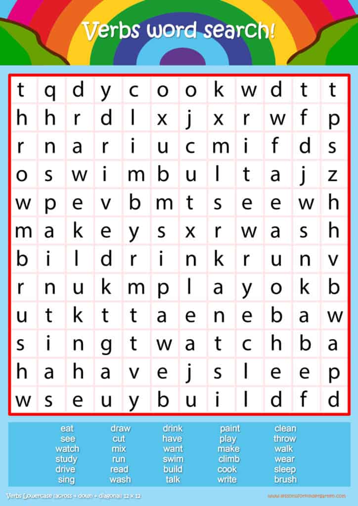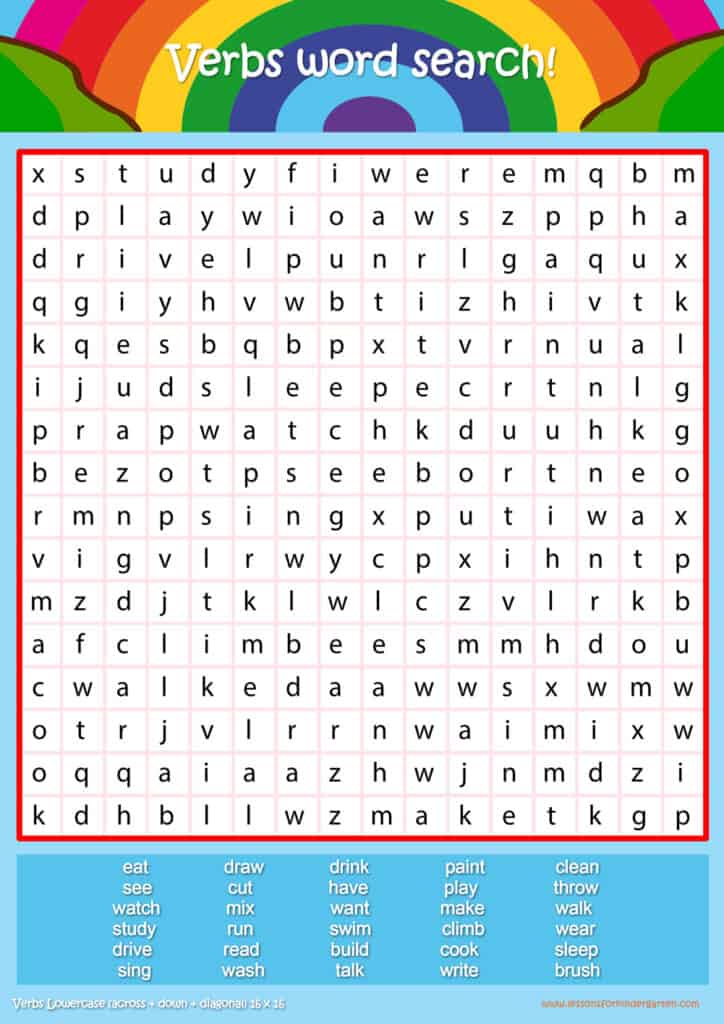 Free verbs word search puzzle sheets for kids! Simply click and download the PDFS for FREE! These verbs word search puzzle sheets are perfect for reinforcing vocabulary your children have learned in your lesson! The worksheets are designed to be used as an activity after teaching your topic’s vocabulary. The verbs word search puzzles help with letter recognition, reading and spelling.