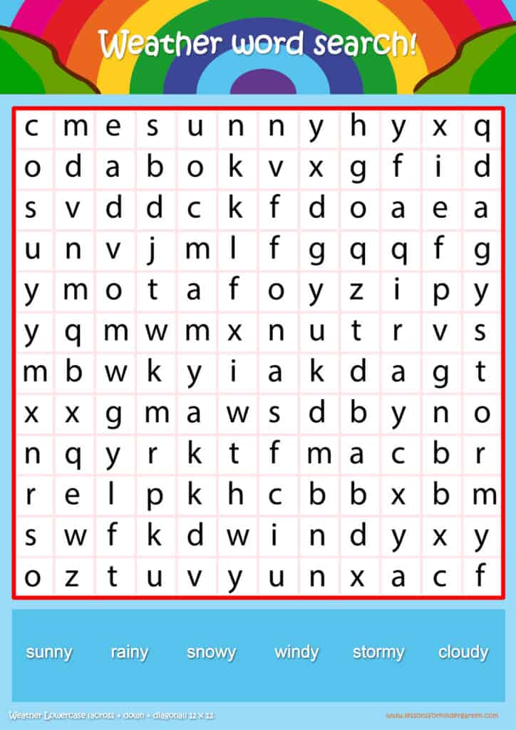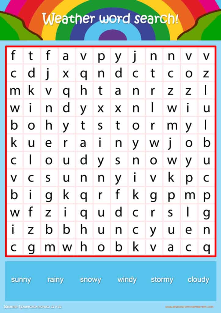 | Weather Lowercase Word Search Puzzle 12 x12 | Read 6 Weather vocabulary words in lowercase |