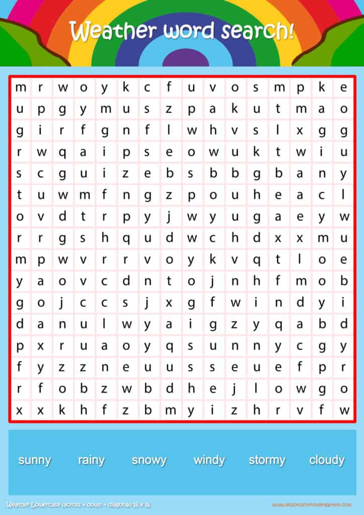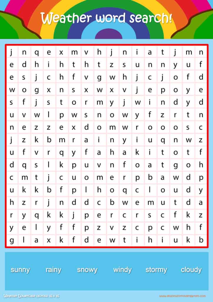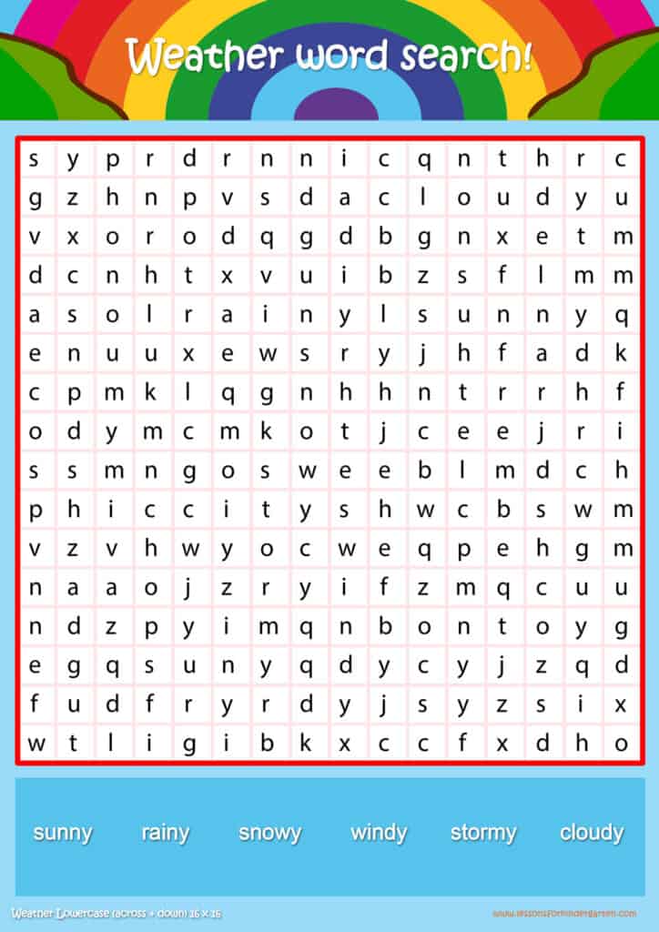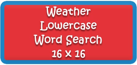 | Weather Lowercase Word Search Puzzle 16 x16 | Read 6 Weather vocabulary words in lowercase |