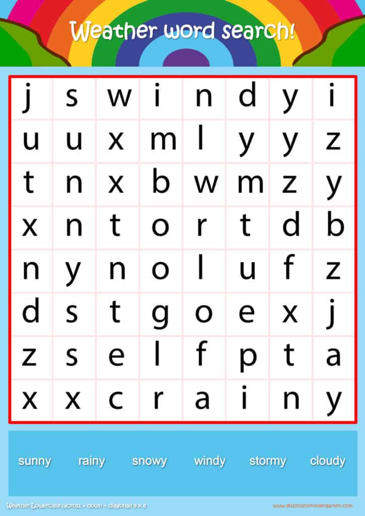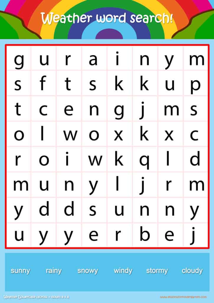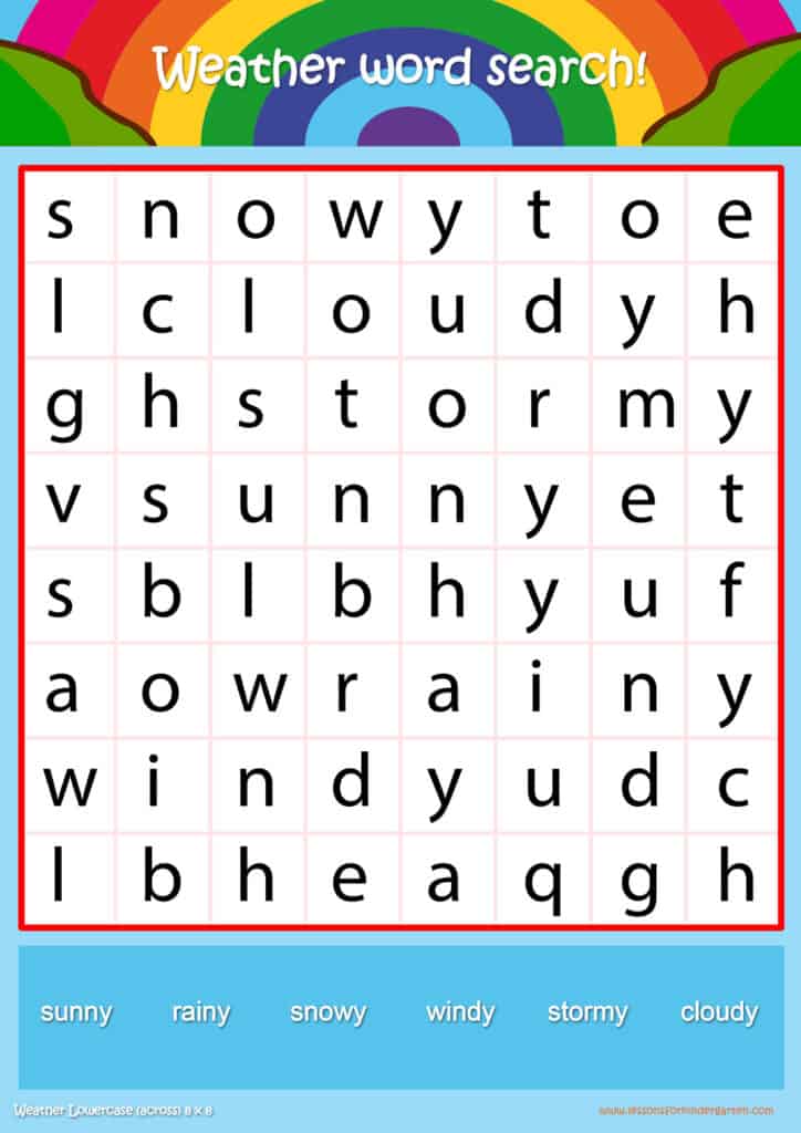 | Weather Lowercase Word Search Puzzle 8 x 8 | Read 6 Weather vocabulary words in lowercase |