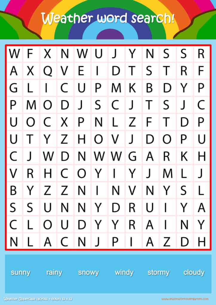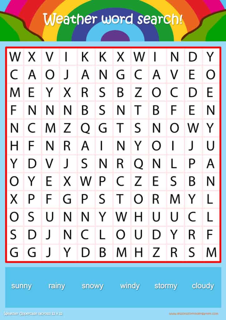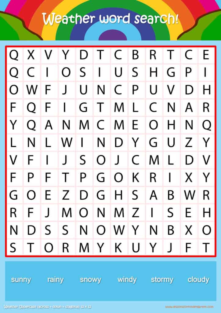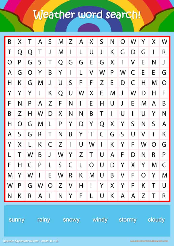 Free weather word search puzzle sheets for kids! Simply click and download the PDFS for FREE! These weather word search puzzle sheets are perfect for reinforcing vocabulary your children have learned in your lesson! The worksheets are designed to be used as an activity after teaching your topic’s vocabulary. The weather word search puzzles help with letter recognition, reading and spelling.
