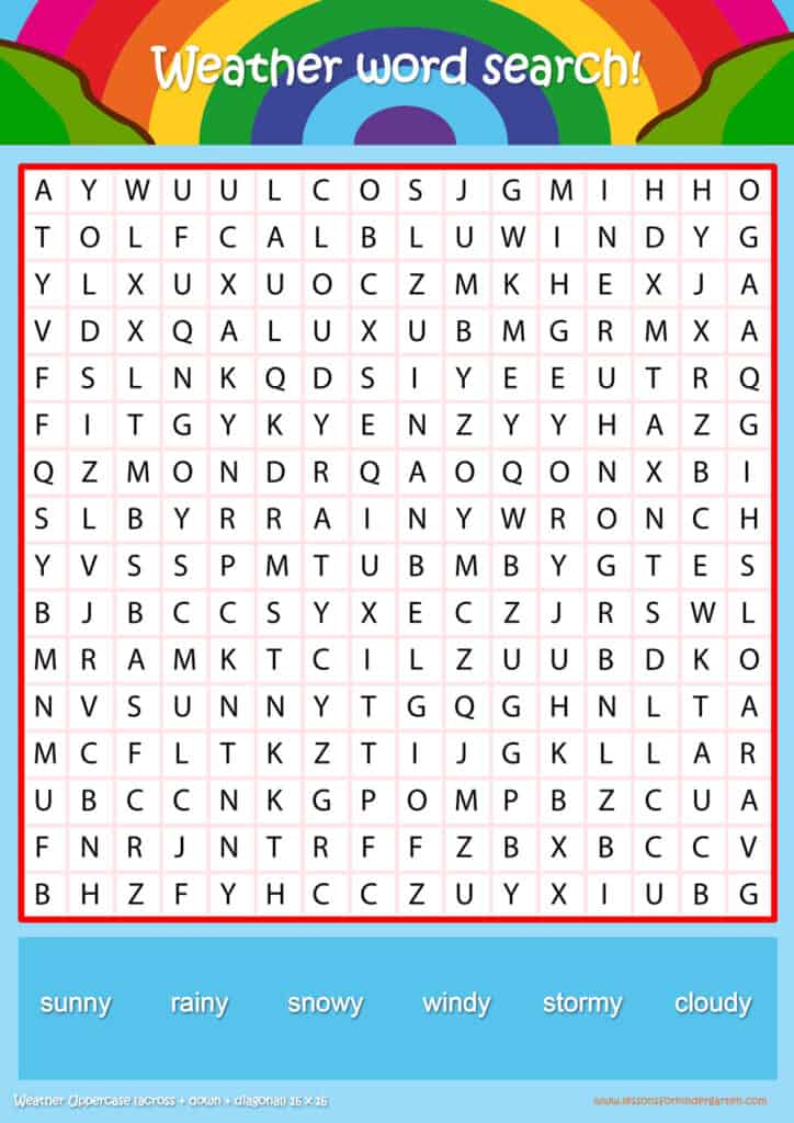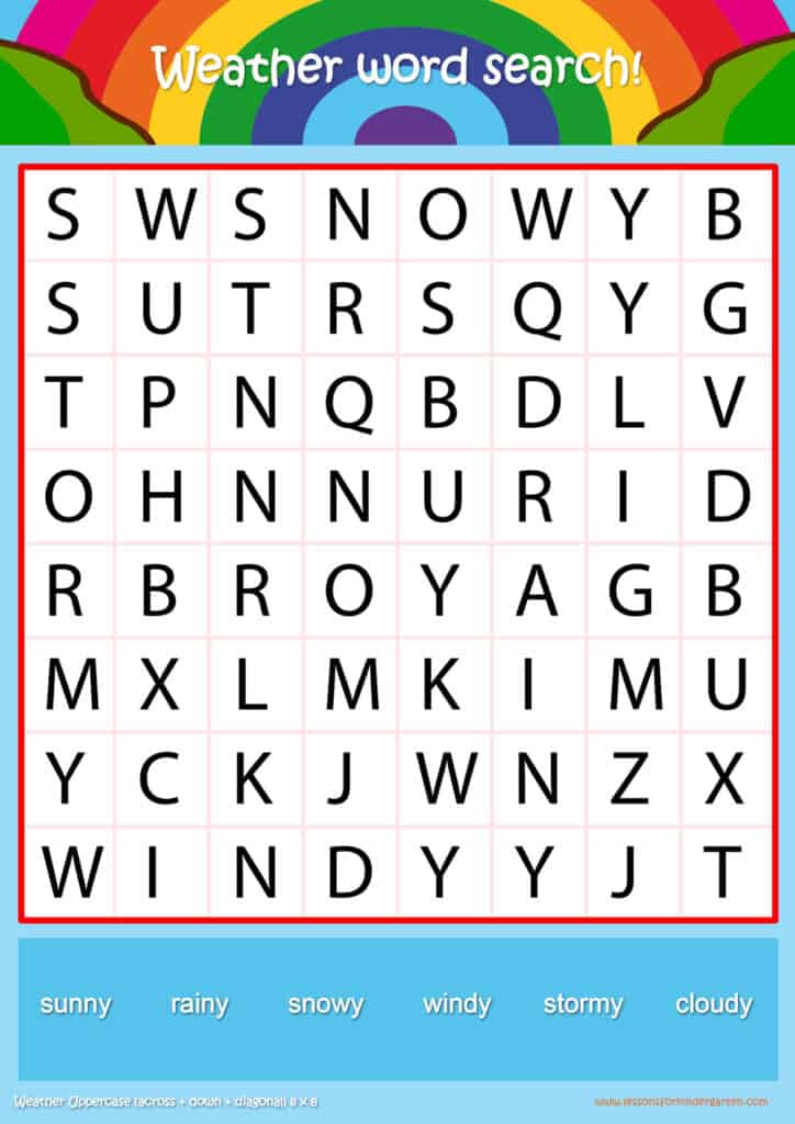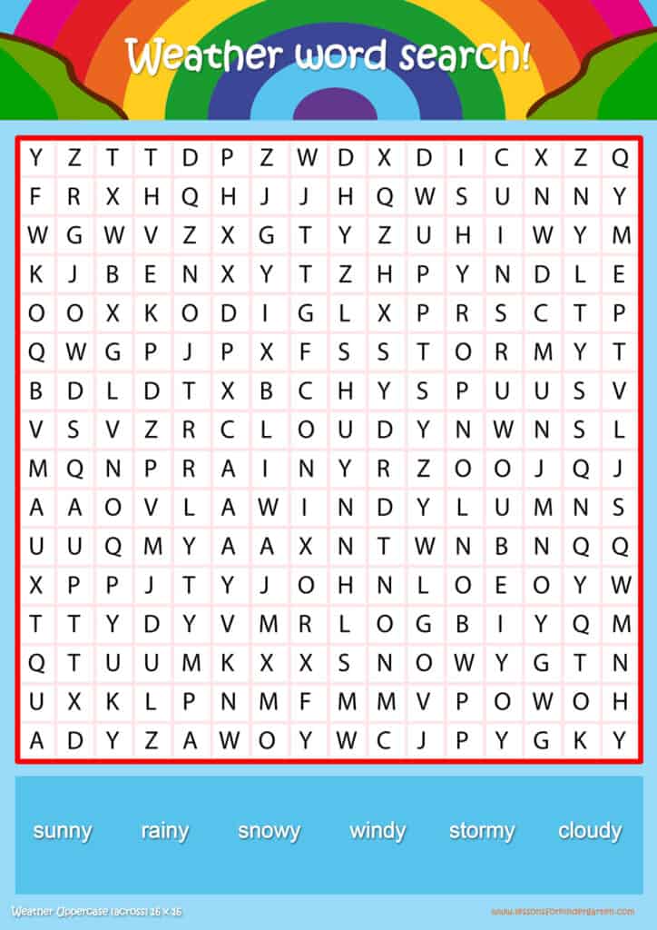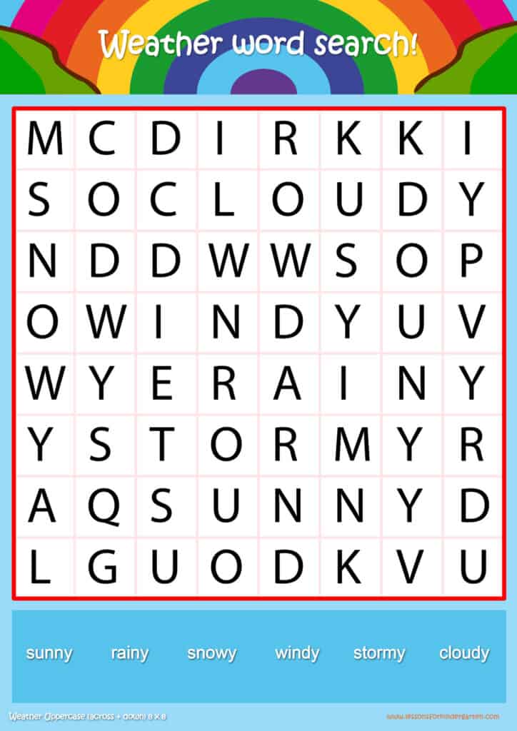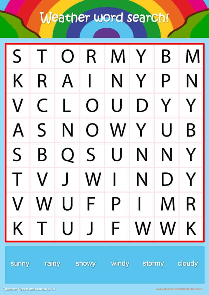 Free weather word search puzzle sheets for kids! Simply click and download the PDFS for FREE! These weather word search puzzle sheets are perfect for reinforcing vocabulary your children have learned in your lesson! The worksheets are designed to be used as an activity after teaching your topic’s vocabulary. The weather word search puzzles help with letter recognition, reading and spelling.